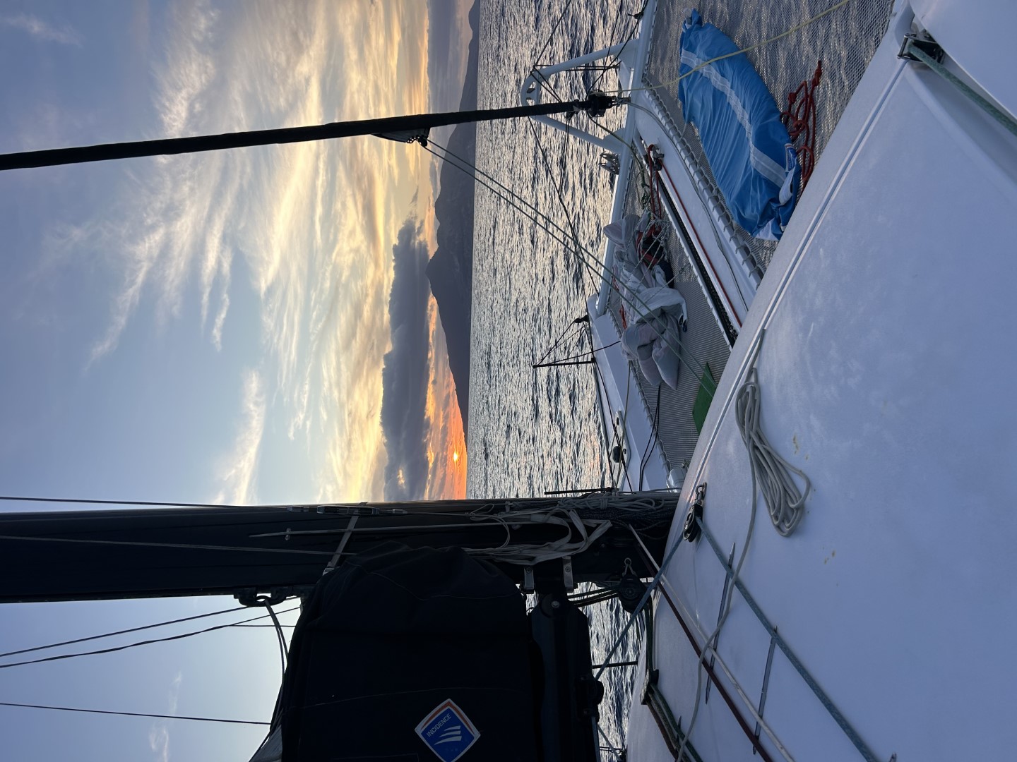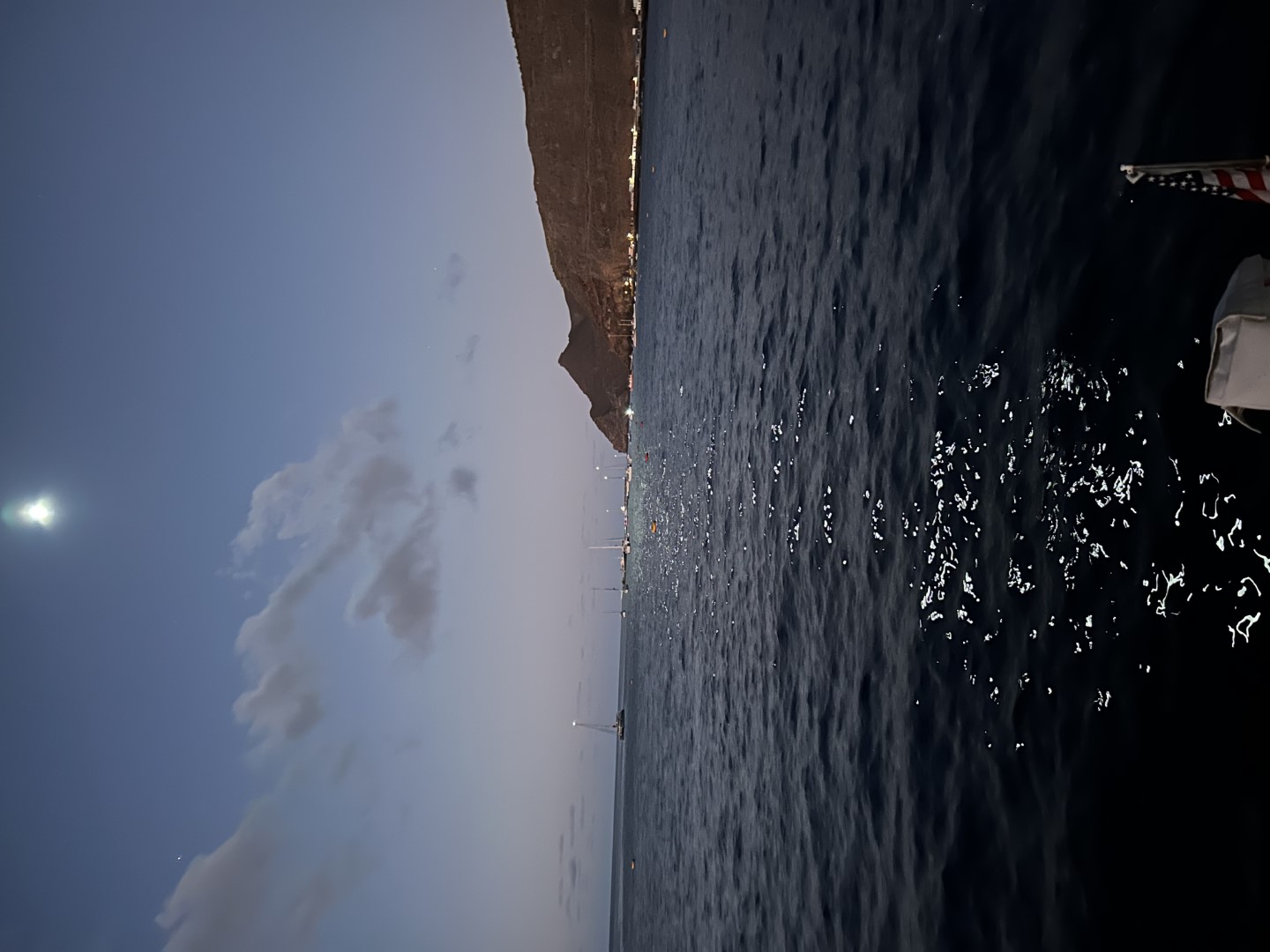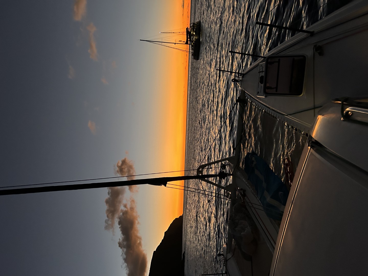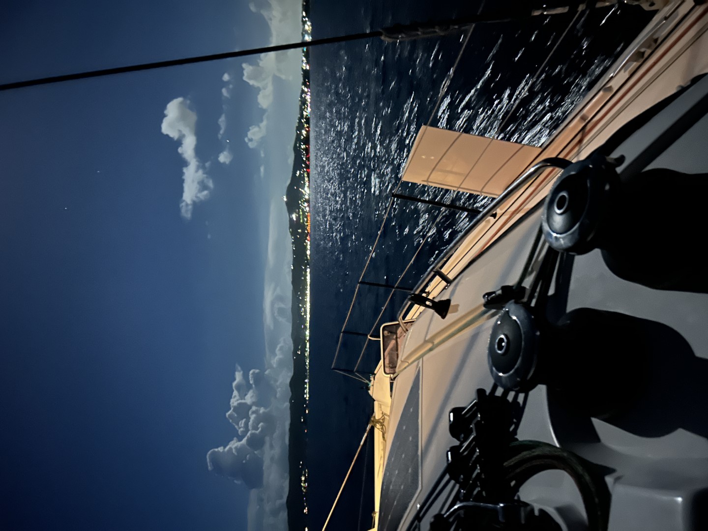 We arrived at night, as usual for Leviathan. I may have made this observation before, but it bears repeating: why don’t we adjust our speed to arrive during daylight? To answer this, I must invoke Yong’s first rule of sailing: When you have wind, you take it! So, we take the wind as it comes. You would think that statistically we would have even odds for a daylight arrival, but our experience has shown that we have a better than 80% chance of a nighttime arrival. Anyway, this arrival was particularly challenging. There was a new moon (i.e., no moonlight) and we had to maneuver through a minefield of boats which occupied a mooring field positioned outside of the anchorage. Yong stood at the bow with a spotlight and guided us as we crept along, weaving our way through the maze. Eventually, we anchored safely and had a peaceful night.