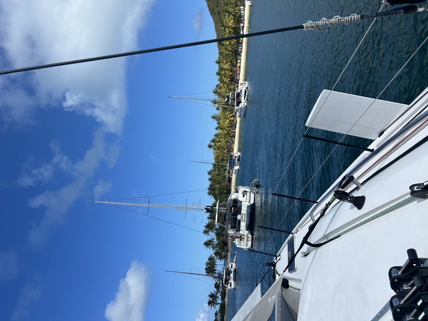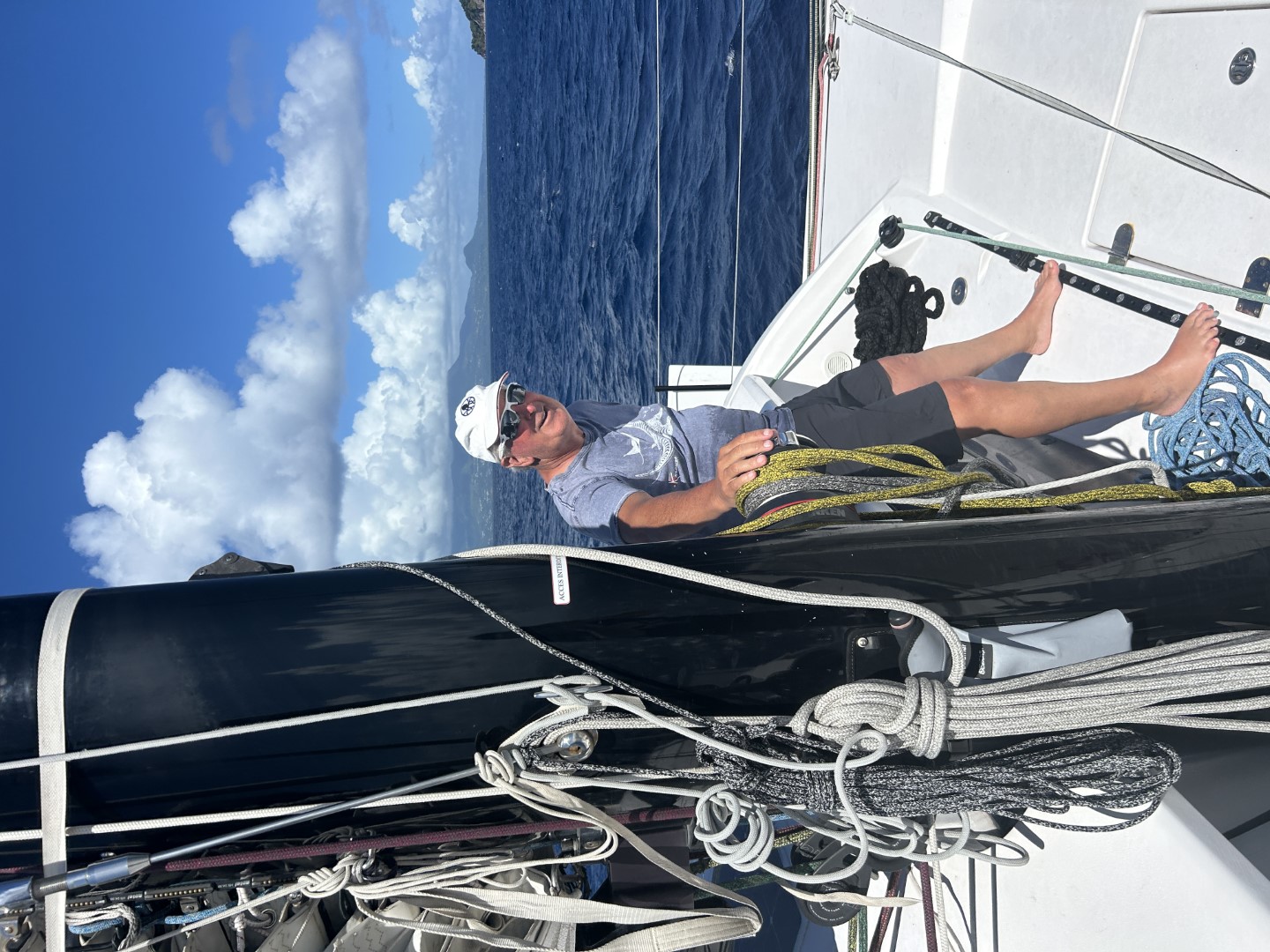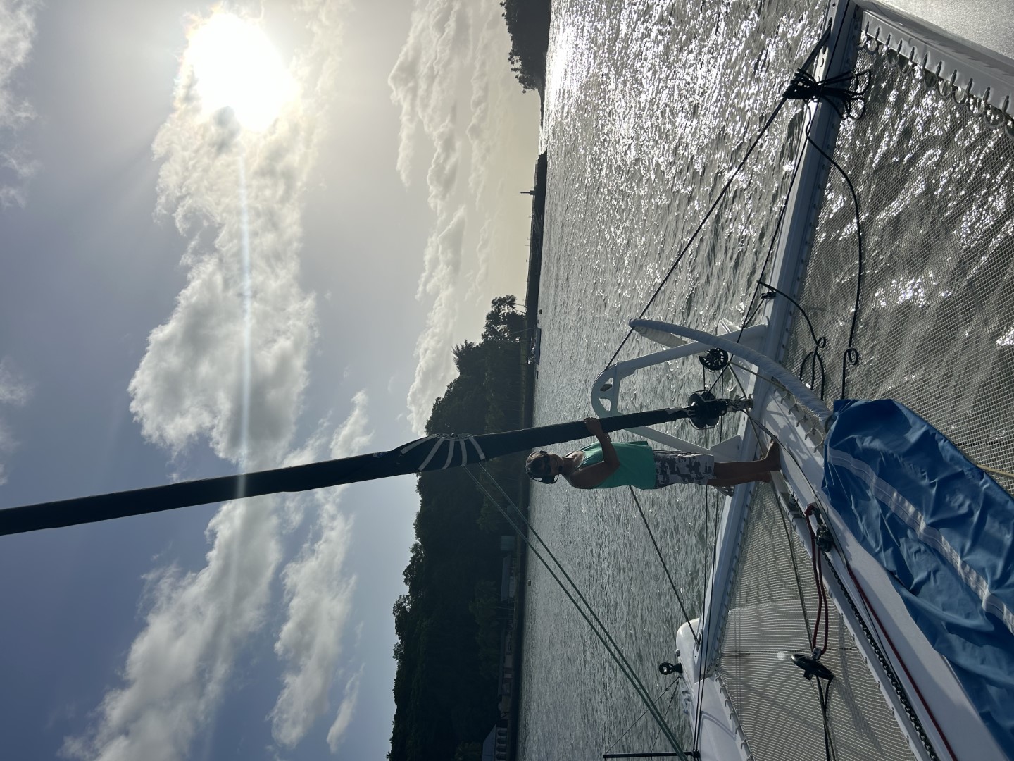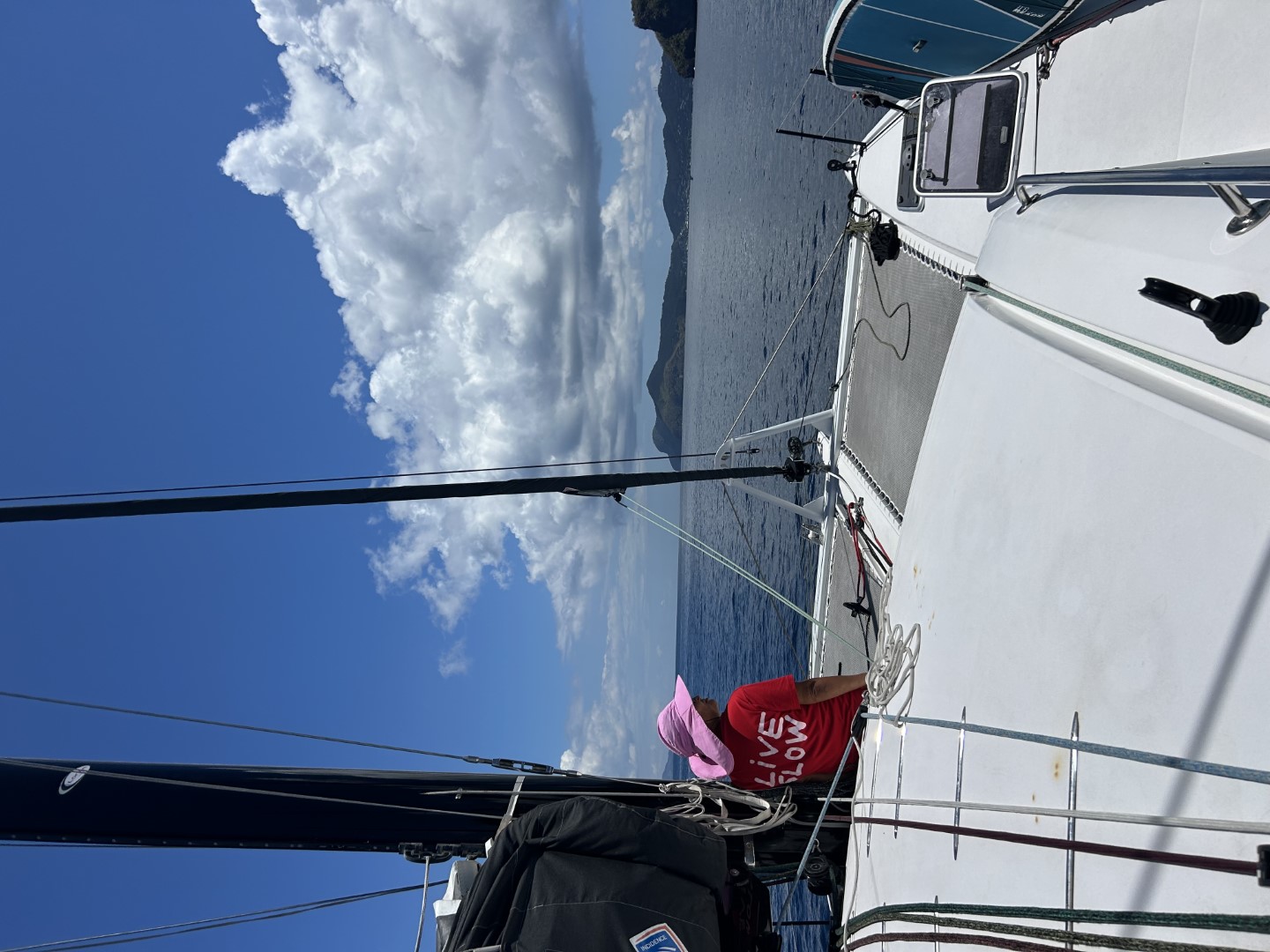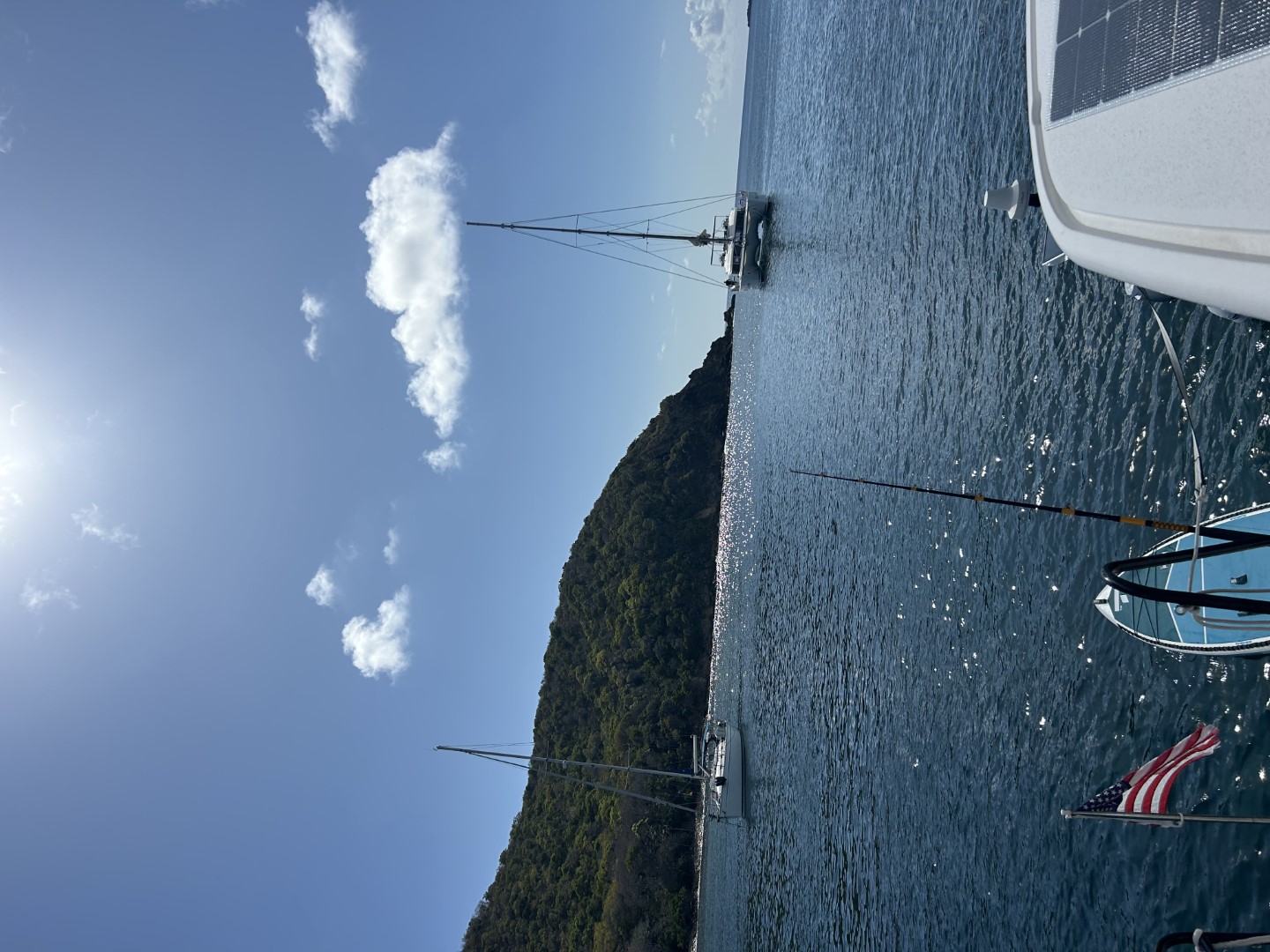 The next morning, we assessed the damage. Thanks to our friends on Renegade, Panterita, and Nizhoni, we were able to free the propeller and fix another problem at the top of our mast (topping lift jumped its sheave). We also examined the broken steel steering cable and formulated a plan to replace it with dyneema (a very strong polyethylene line). The following day, in between frequent rain squalls, we successfully accomplished the repair. We celebrated with a long swim in the beautiful warm bay. Tomorrow, we will explore the island!