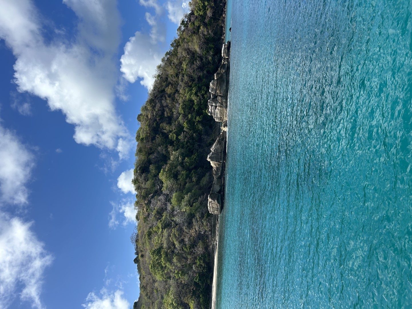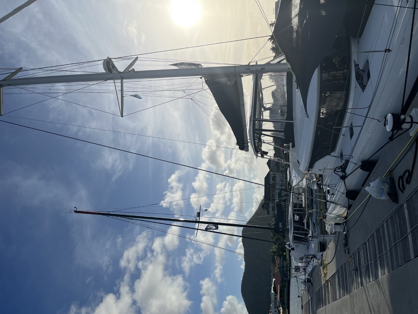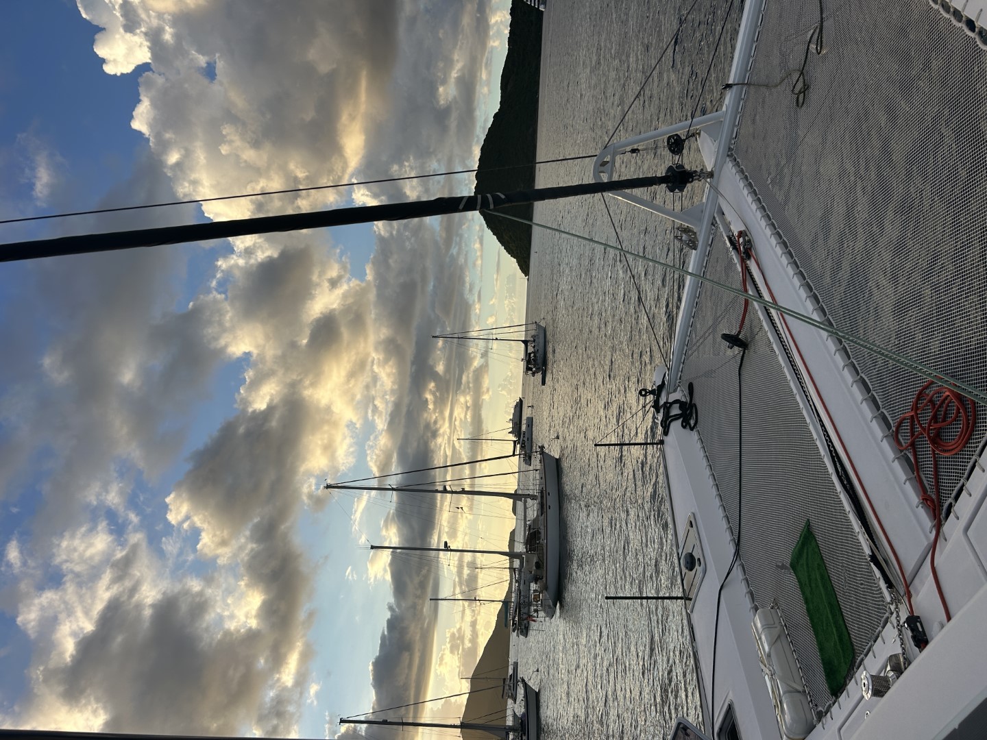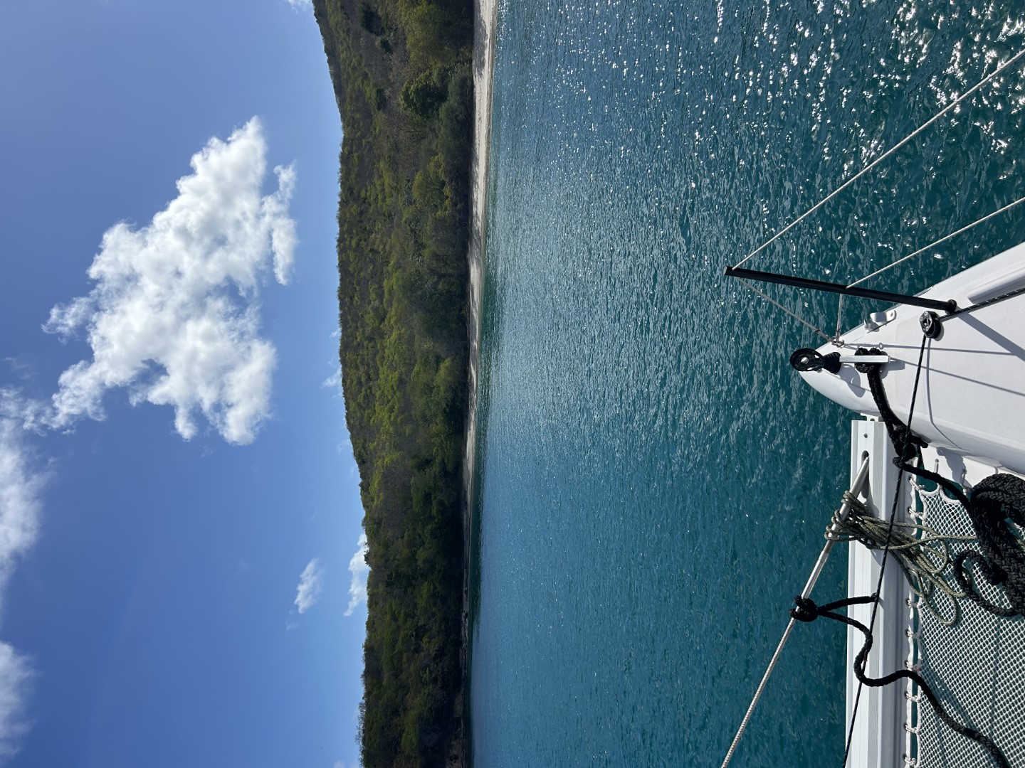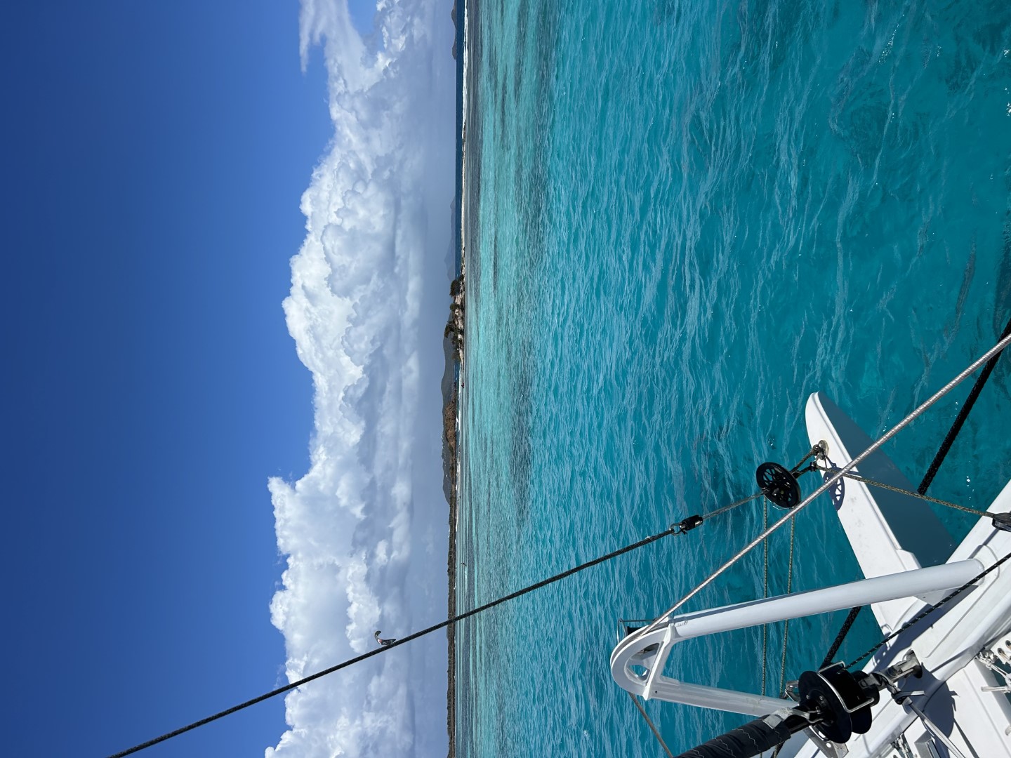 The next morning, we assessed the damage. Thanks to our friends on Renegade, Panterita, and Nizhoni, we were able to free the propeller and fix another problem at the top of our mast (topping lift jumped its sheave). We also examined the broken steel steering cable and formulated a plan to replace it with dyneema (a very strong polyethylene line). The following day, in between frequent rain squalls, we successfully accomplished the repair. We celebrated with a long swim in the beautiful warm bay. Tomorrow, we will explore the island!