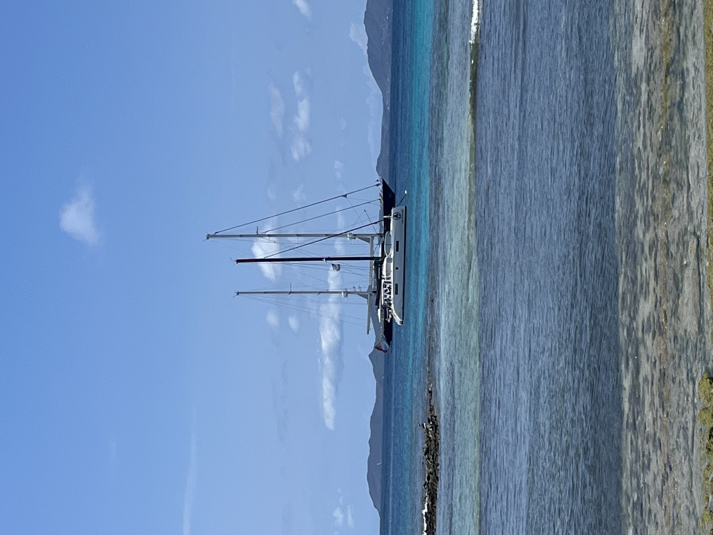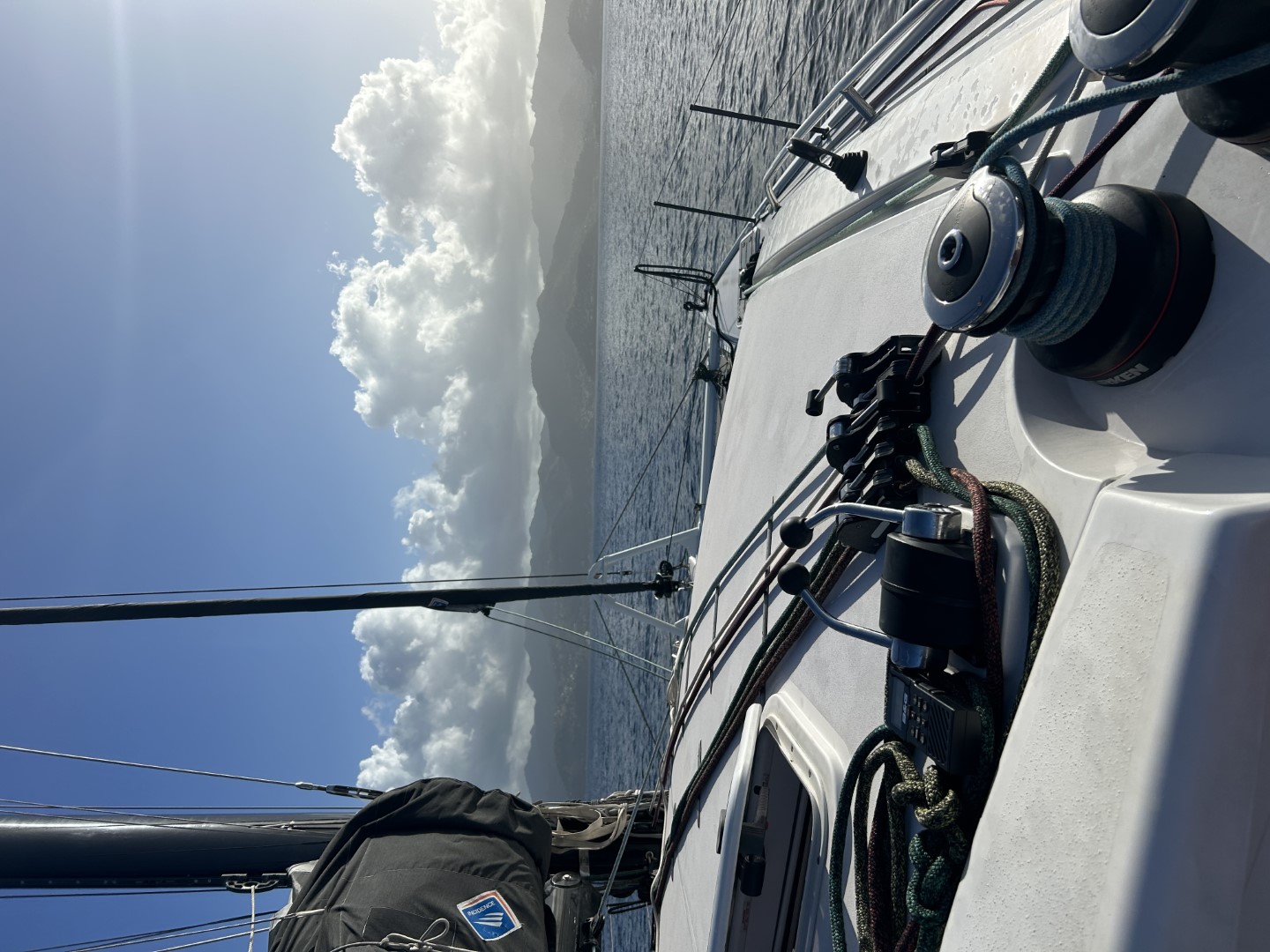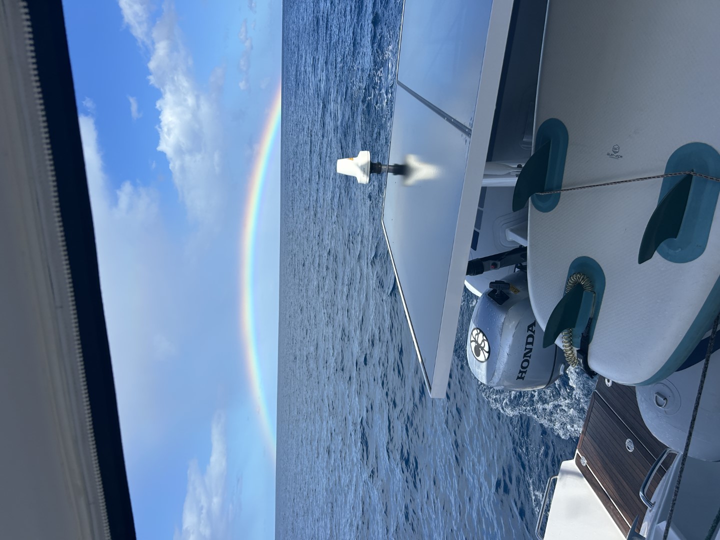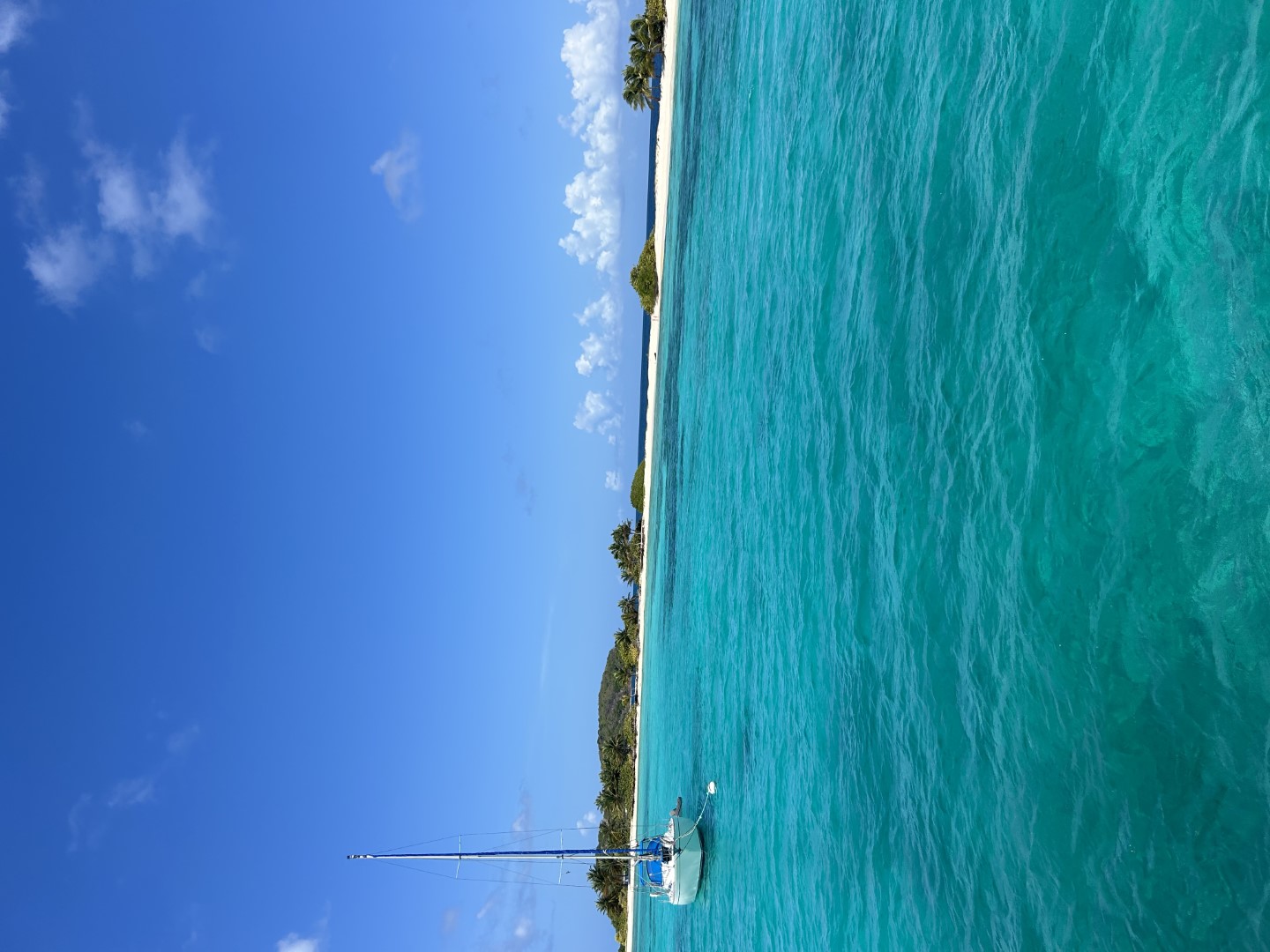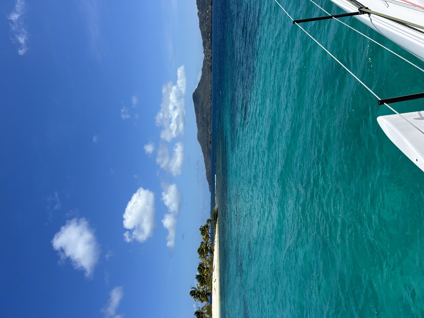 The next morning, we assessed the damage. Thanks to our friends on Renegade, Panterita, and Nizhoni, we were able to free the propeller and fix another problem at the top of our mast (topping lift jumped its sheave). We also examined the broken steel steering cable and formulated a plan to replace it with dyneema (a very strong polyethylene line). The following day, in between frequent rain squalls, we successfully accomplished the repair. We celebrated with a long swim in the beautiful warm bay. Tomorrow, we will explore the island!