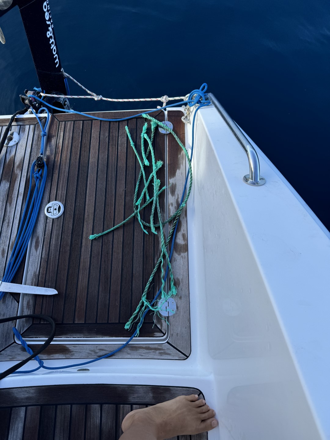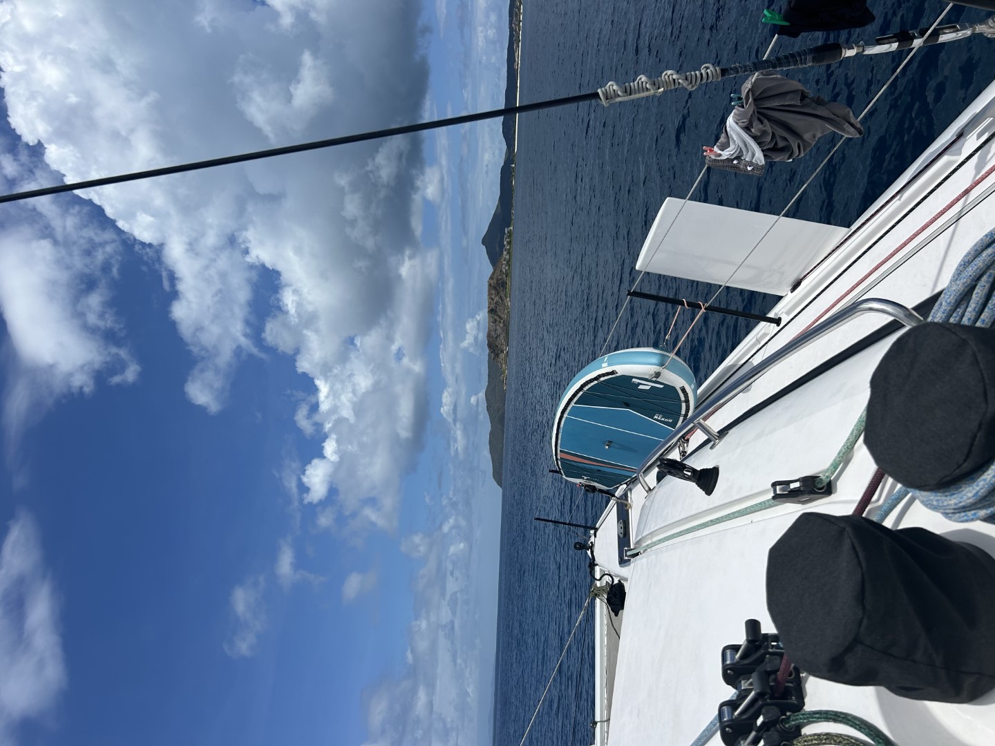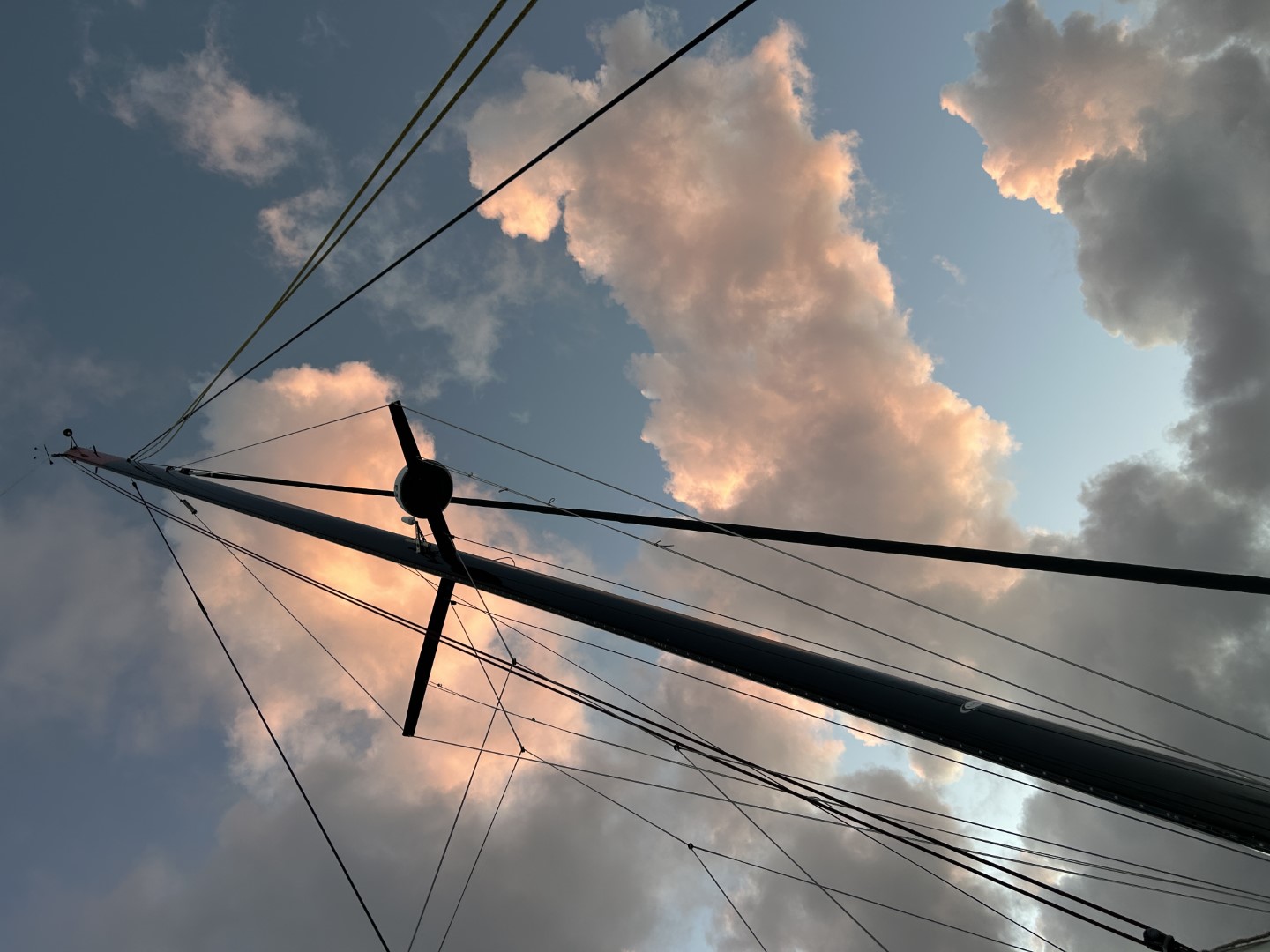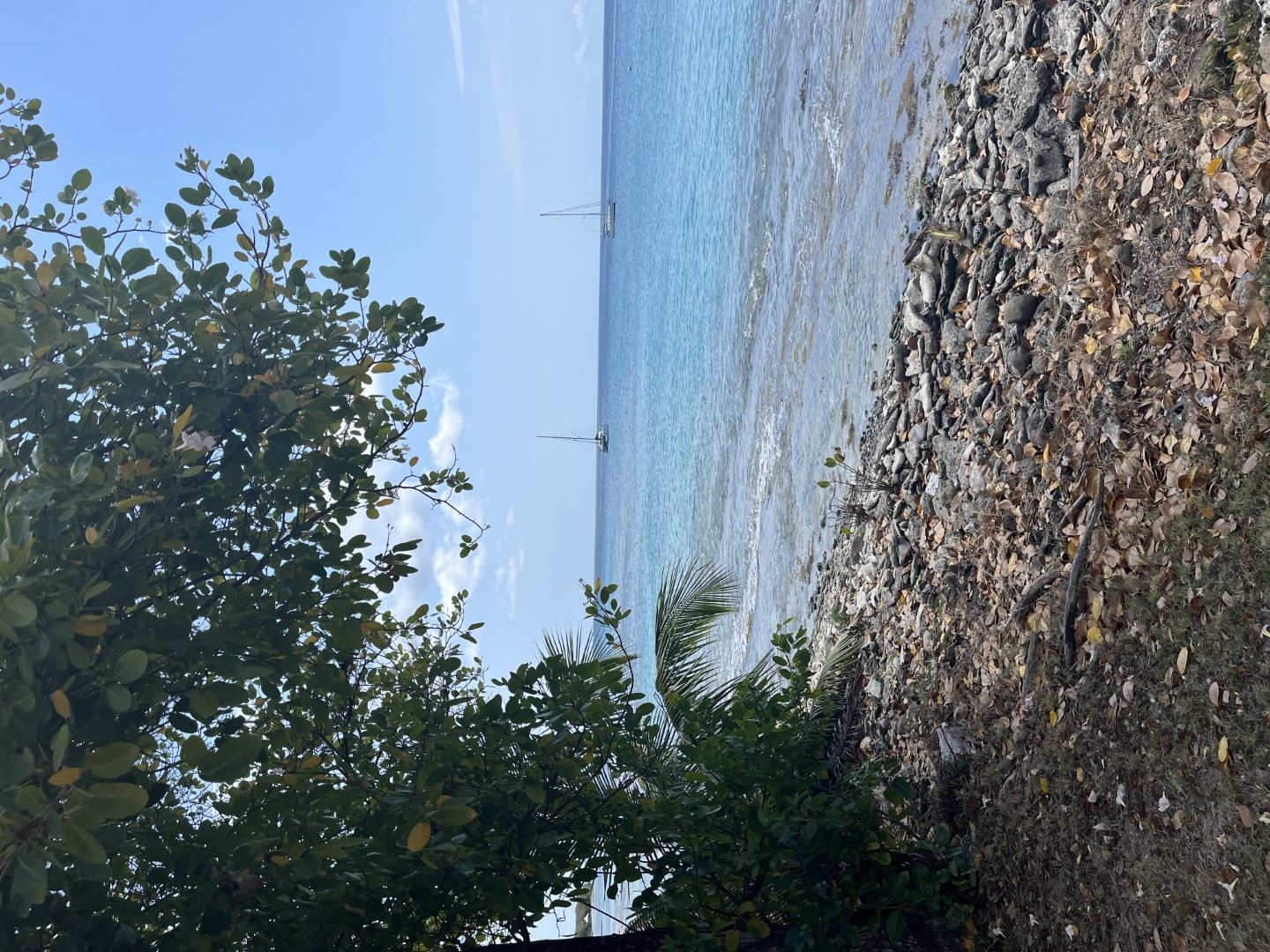 The next morning, we assessed the damage. Thanks to our friends on Renegade, Panterita, and Nizhoni, we were able to free the propeller and fix another problem at the top of our mast (topping lift jumped its sheave). We also examined the broken steel steering cable and formulated a plan to replace it with dyneema (a very strong polyethylene line). The following day, in between frequent rain squalls, we successfully accomplished the repair. We celebrated with a long swim in the beautiful warm bay. Tomorrow, we will explore the island!