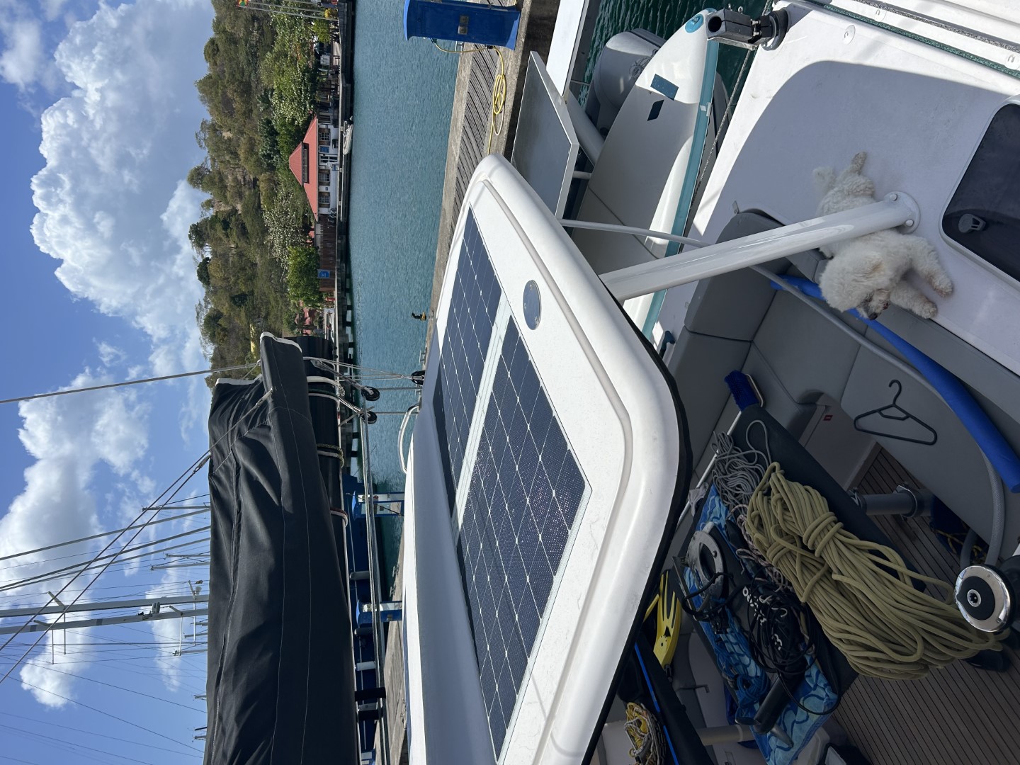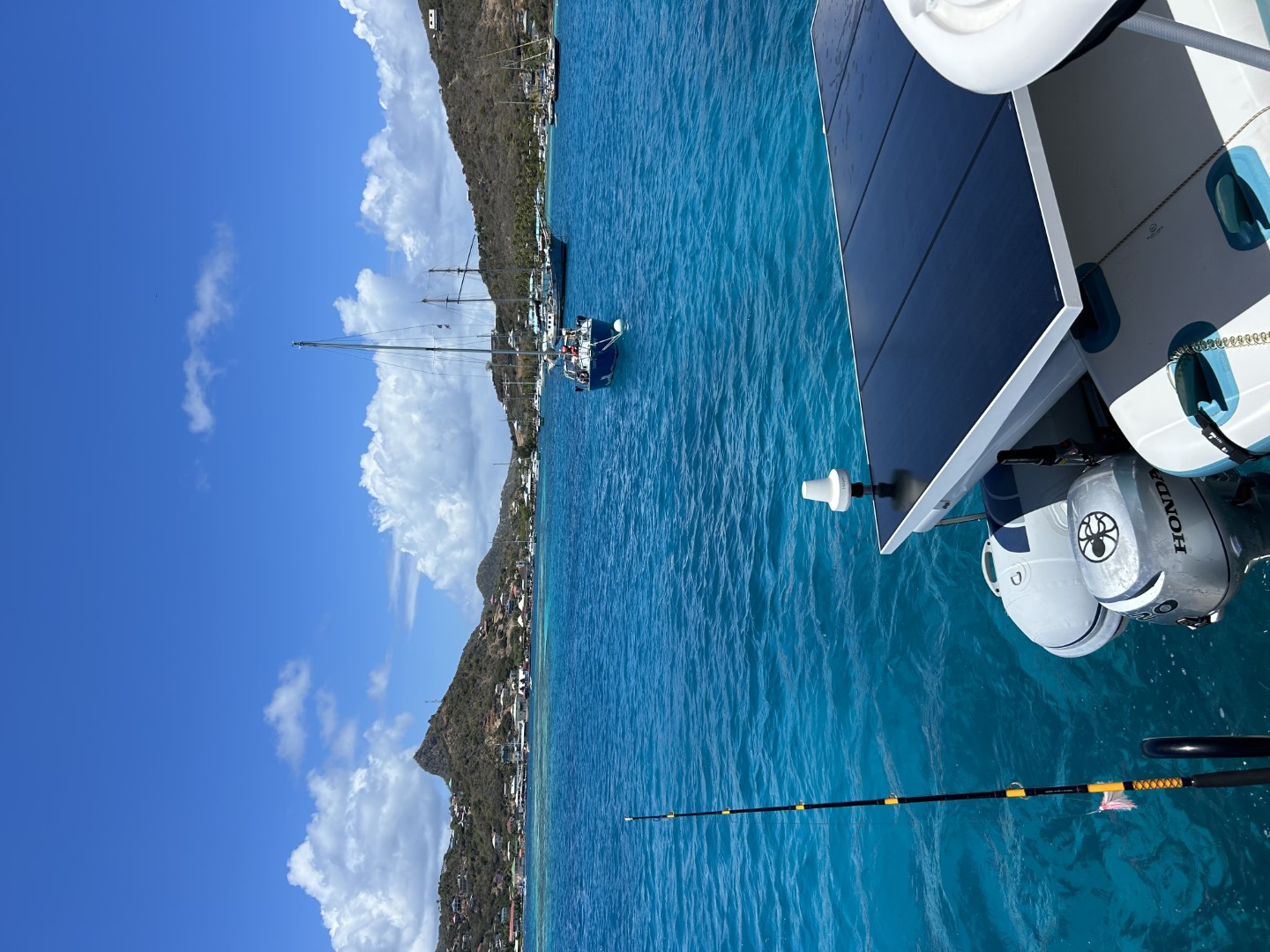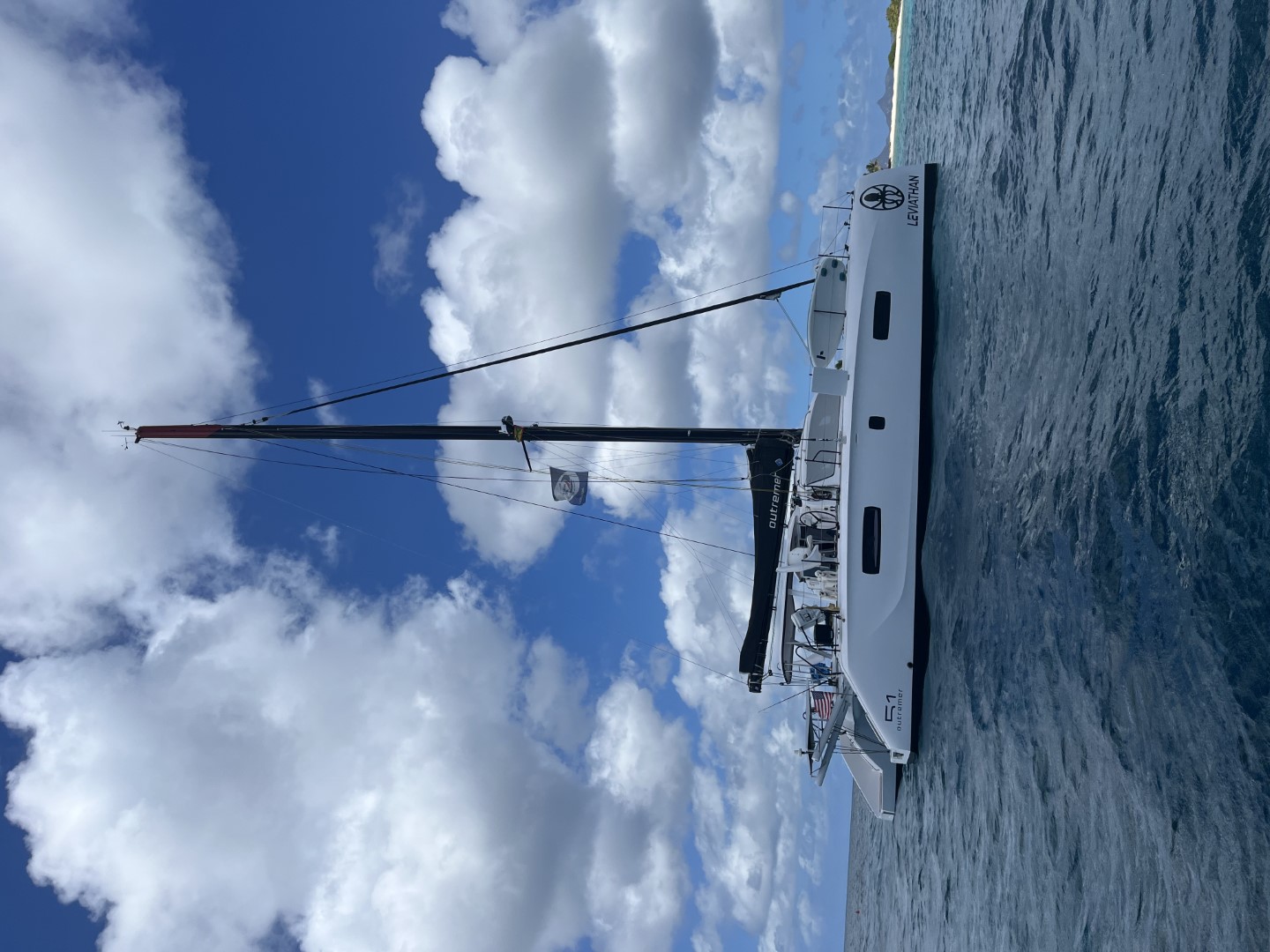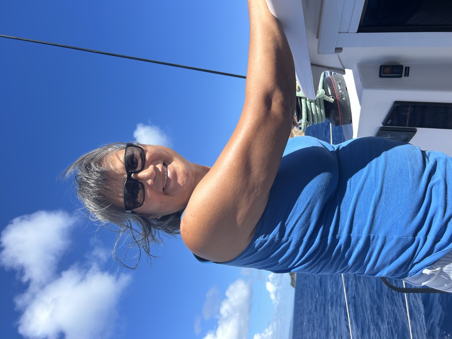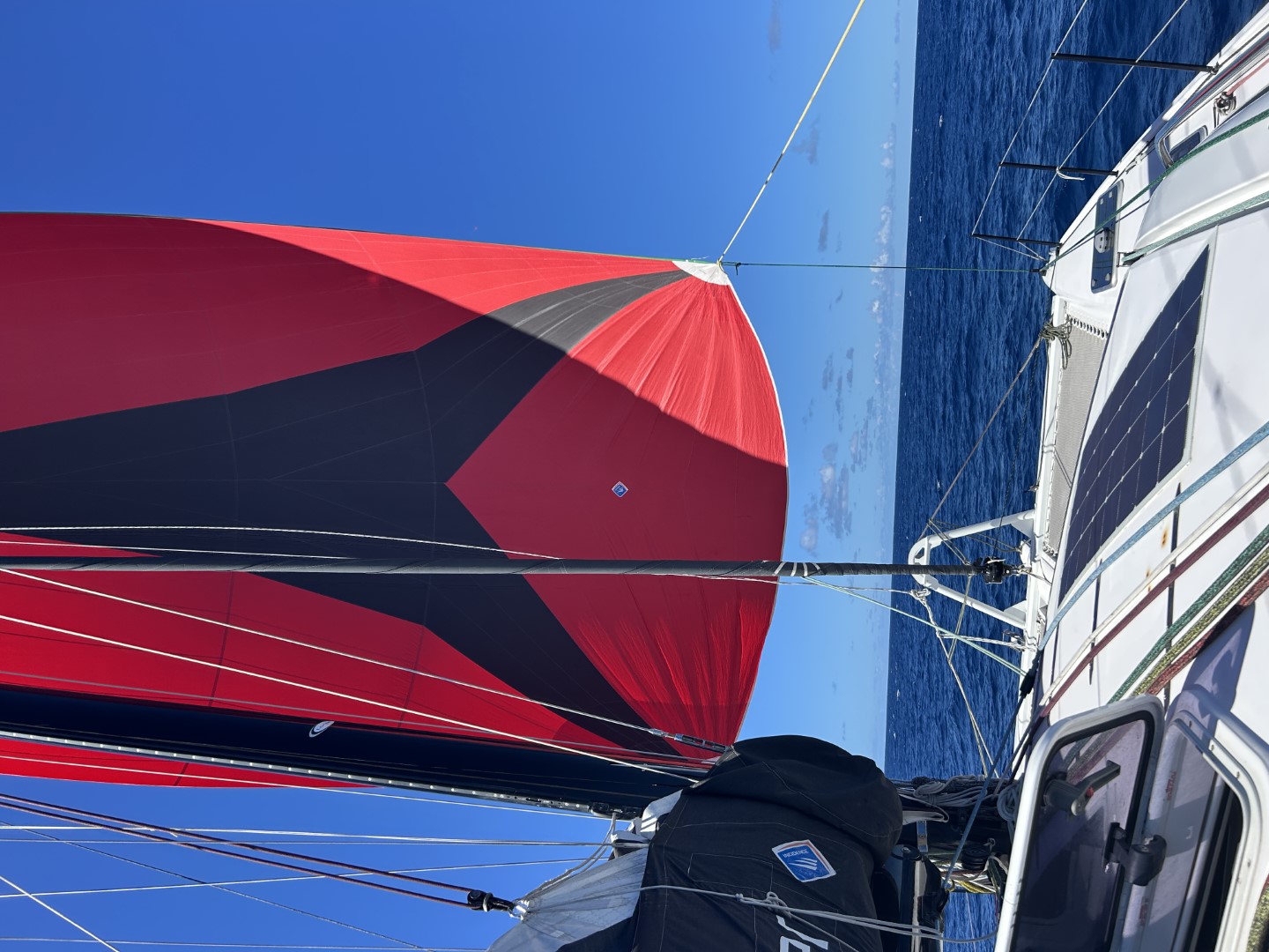 The next morning, we assessed the damage. Thanks to our friends on Renegade, Panterita, and Nizhoni, we were able to free the propeller and fix another problem at the top of our mast (topping lift jumped its sheave). We also examined the broken steel steering cable and formulated a plan to replace it with dyneema (a very strong polyethylene line). The following day, in between frequent rain squalls, we successfully accomplished the repair. We celebrated with a long swim in the beautiful warm bay. Tomorrow, we will explore the island!
