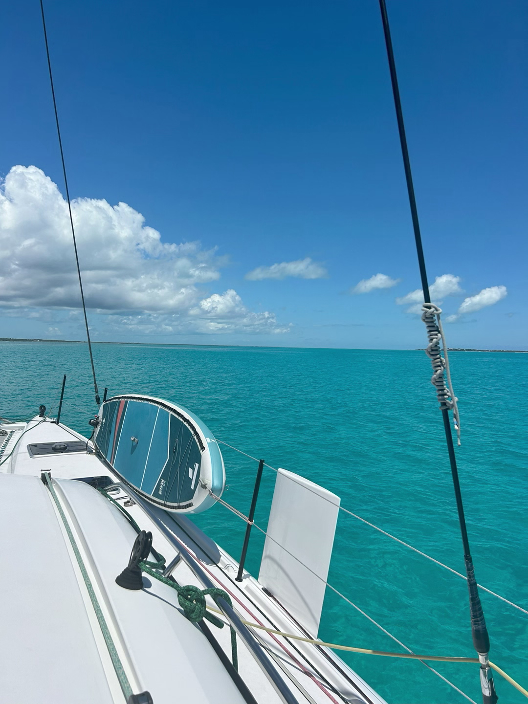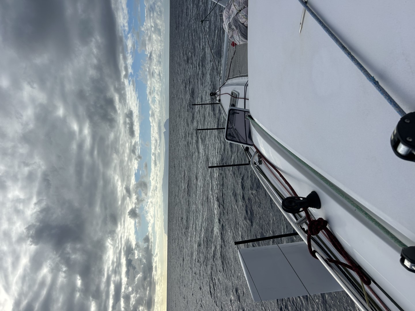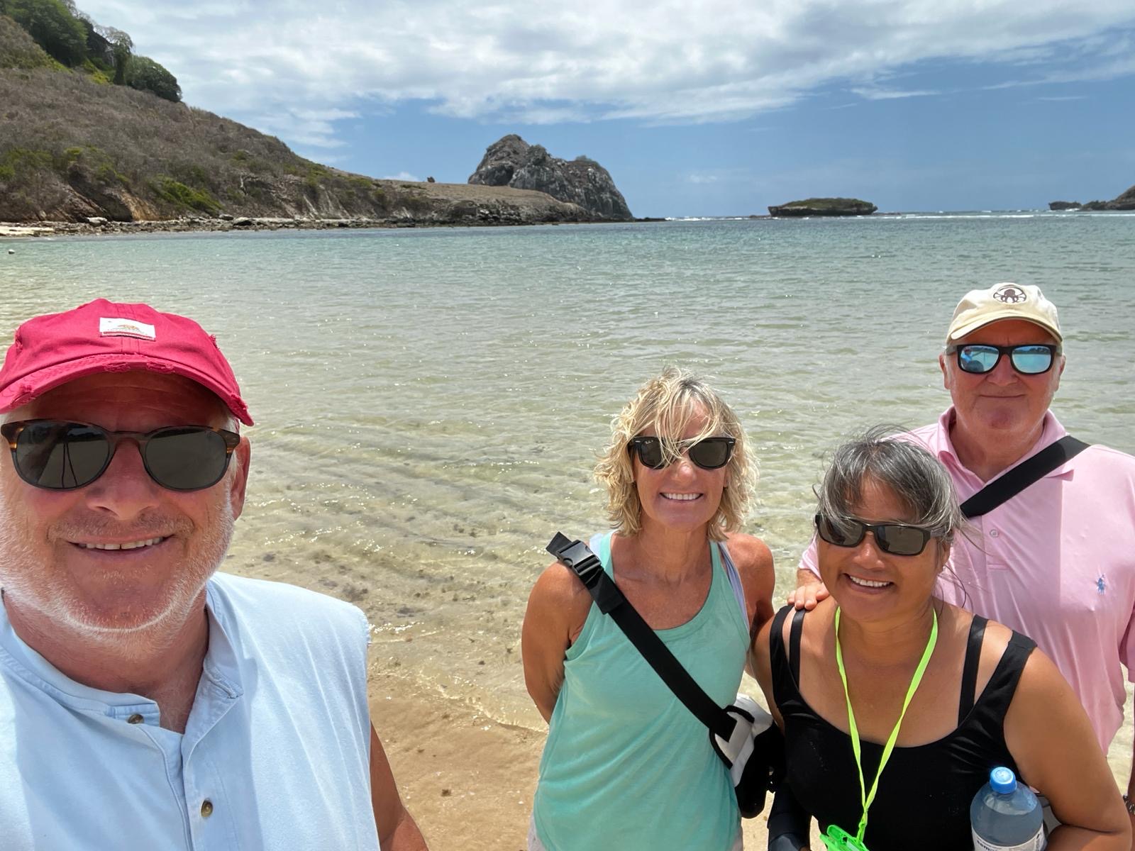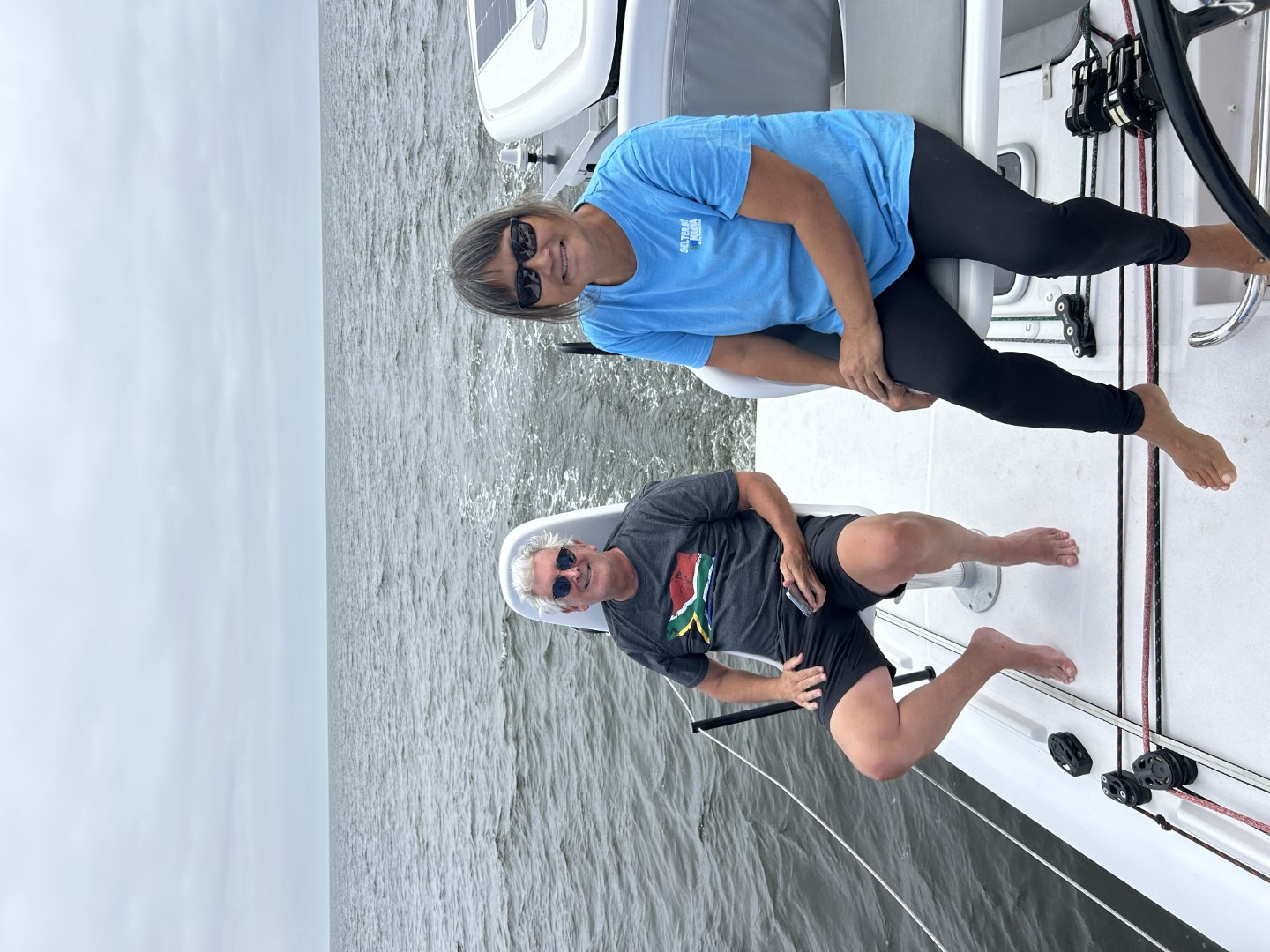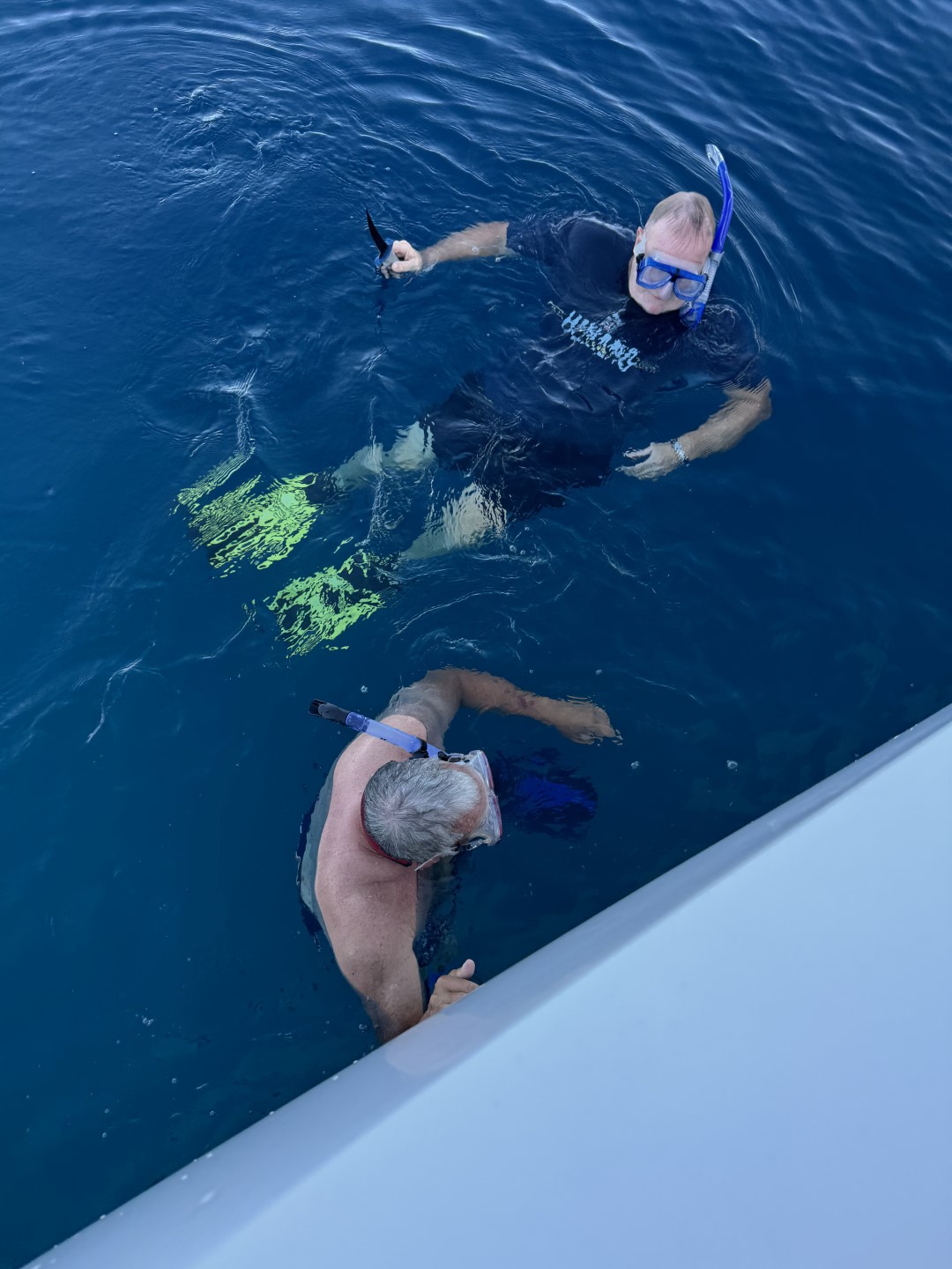 The next morning, we assessed the damage. Thanks to our friends on Renegade, Panterita, and Nizhoni, we were able to free the propeller and fix another problem at the top of our mast (topping lift jumped its sheave). We also examined the broken steel steering cable and formulated a plan to replace it with dyneema (a very strong polyethylene line). The following day, in between frequent rain squalls, we successfully accomplished the repair. We celebrated with a long swim in the beautiful warm bay. Tomorrow, we will explore the island!