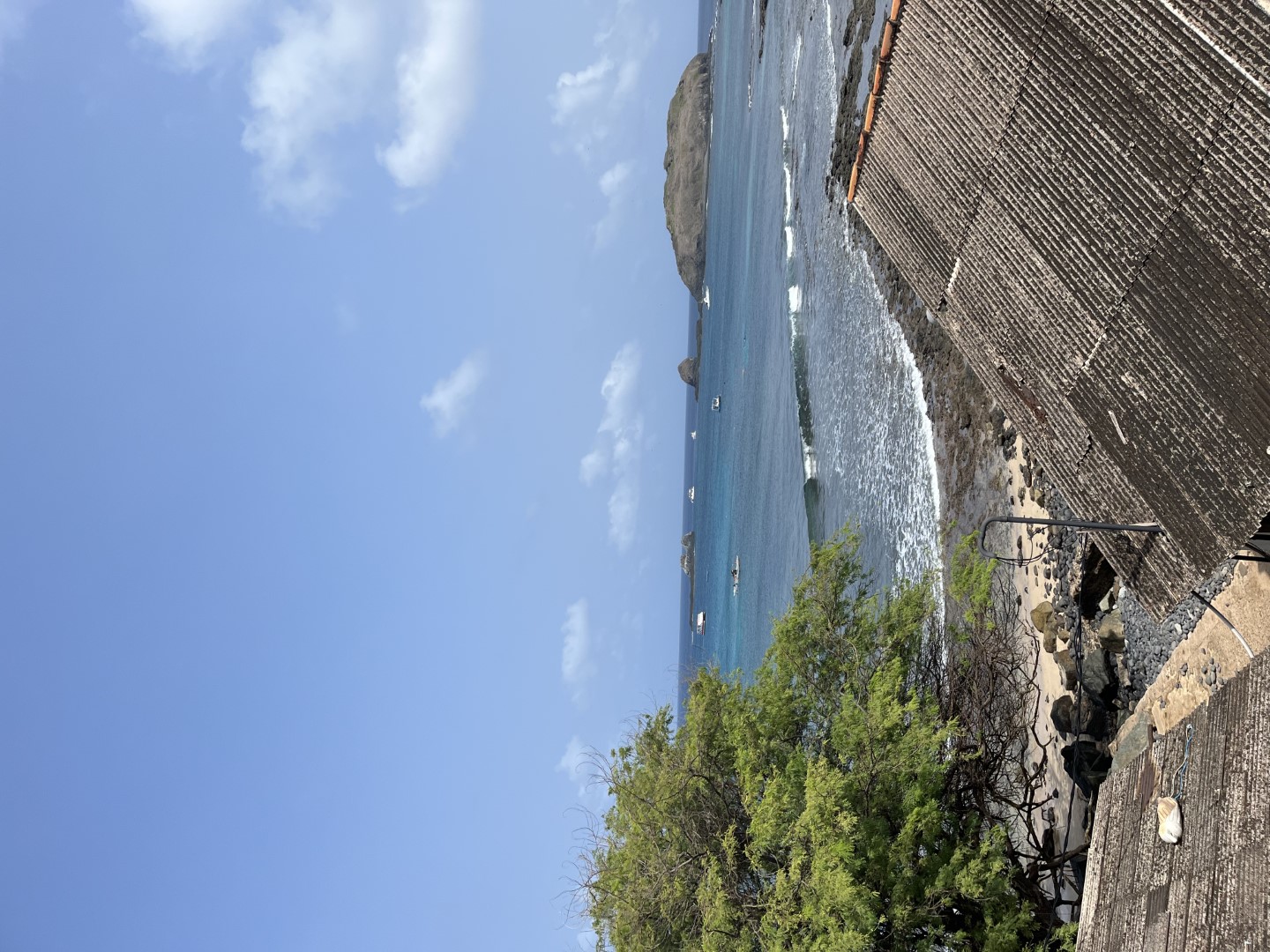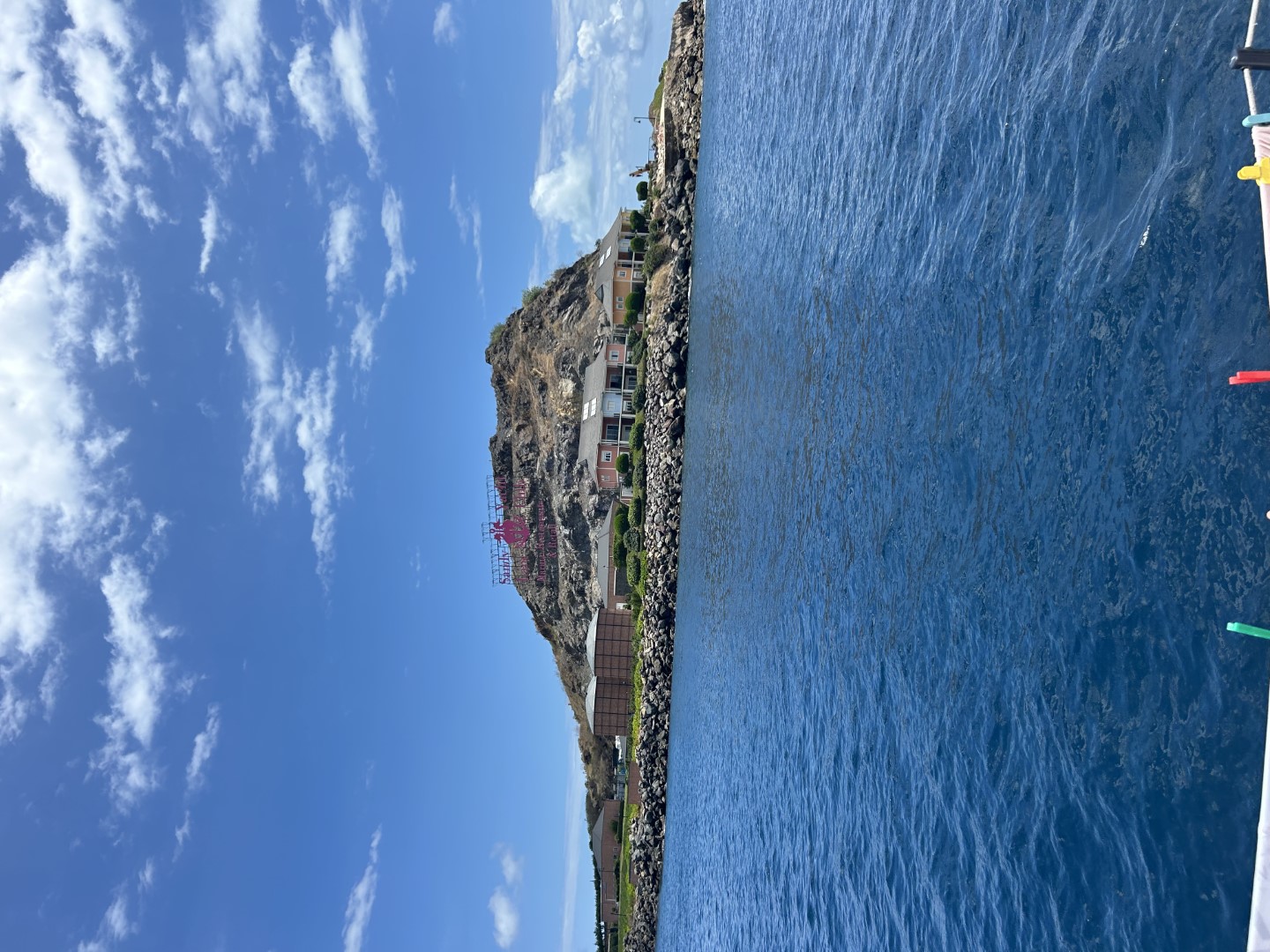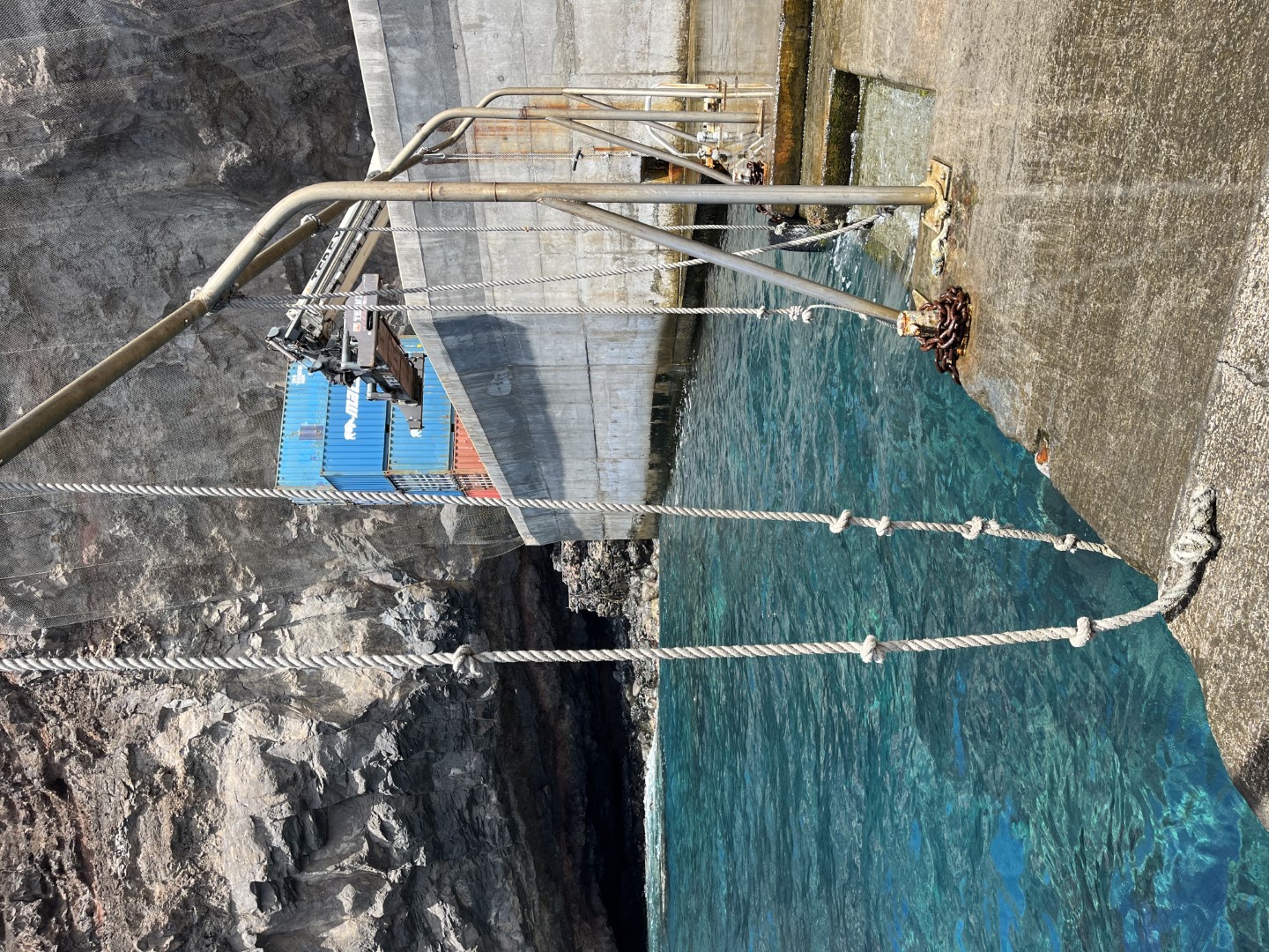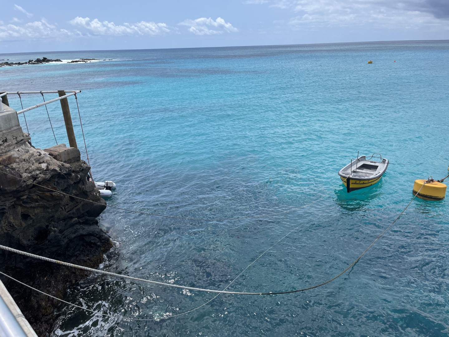 Getting to shore is interesting, and I should describe this process in some detail. When we first arrived, we encountered a cement wall exposed to the prevailing surge. We tied our dinghy to a ladder and jumped ashore. This was less than ideal, because our dinghy was battered against the wall with every wave. Oh well, we completed our business, returned to our dinghy, and made it back to Leviathan intact. We subsequently found out that there is another method approved by Port Control: we drop one person off at the wall and then tie off to an adjacent mooring line. Next, we scramble from our dinghy to a wooden yellow row boat which is also attached to the mooring line by a block (pulley) with lines leading to shore. The shore person then pulls the yellow boat to the wall, thereby allowing the remaining passenger ashore. The yellow boat is then repositioned, ready for the next shuttle.
