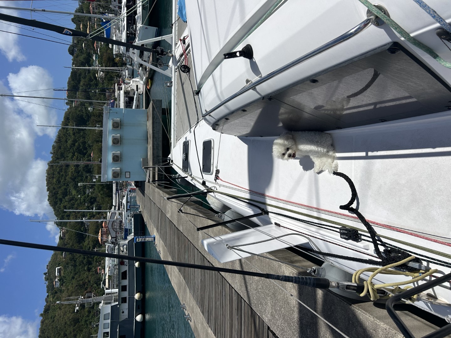We arrived in St. Lucia from Bequia following a brisk night sail and initially moored at Marigot Bay, a charming and well-protected harbor. All the rally participants reunited here and enjoyed a few lazy days before our final leg. Yesterday, we assembled in reverse order of boat size and departed Marigot Bay in single file. We paraded along the coast (with a circle in Castries Bay) and crossed the finish line ten miles later in Rodney Bay. At this point we experienced a rush of memories. After over a year of unfamiliar territory, we finally recognized the coastline! And we recalled our dubious start to the rally when we encountered a steering failure and needed to start one day late. As we pulled into the marina and secured our mooring lines, we were overcome by euphoria. We actually did it! Yong and I and our intrepid companions Jake and Pogo have circled our planet Earth. Amazing. And we did it along with many new friends. What a great experience! Our joy was obvious to any observers who witnessed the spectacle of our dockside party. And I must admit that I was suddenly consumed by a desire to do it again! Yong and the dogs were not stricken by this malady as yet, but I am hopeful that this disorder might be contagious. We will take a break and then decide what the future will hold for us. For now, we have some boat work scheduled next week on the adjacent island of Martinique and then a return to Grenada where the boat will reside for hurricane season while we recover in the States. We are currently thinking about spending a season in the Caribbean, but beyond that, we are still uncertain. It’s hard to make predictions, especially about the future.