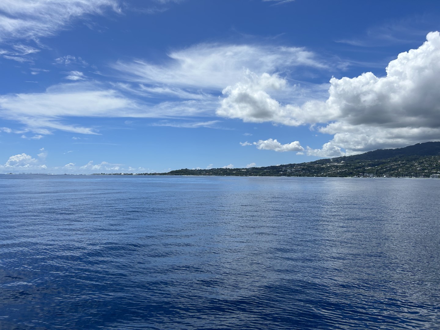 Moorea is another member of the Society Islands of French Polynesia and lies about 10 miles northwest of Tahiti. While we were waiting for the last item of boat work to be accomplished (fashioning a bracket for our new Starlink antenna), we decided to leave Tahiti for a respite in the nearby Moorea. Moorea is a popular honeymoon destination, and it is reputed to be one of the most photographed of the Polynesian islands. As we left Papeete (the capital of Tahiti) and approached the Taapuna Pass, we were accompanied by a couple of boogie boarding hitchhikers who were making their way to the surf. After traversing the pass, we easily made the short passage and dropped our anchor in Cook’s Bay, a beautiful and well-protected anchorage.