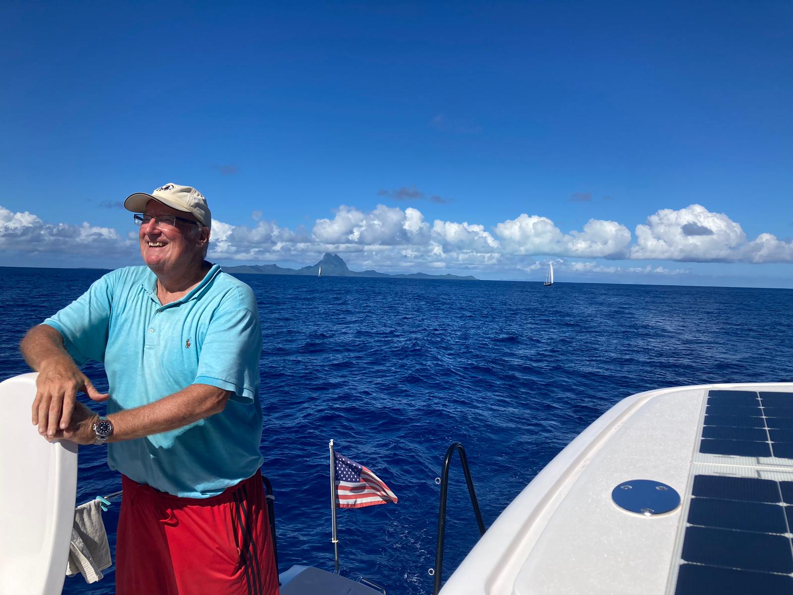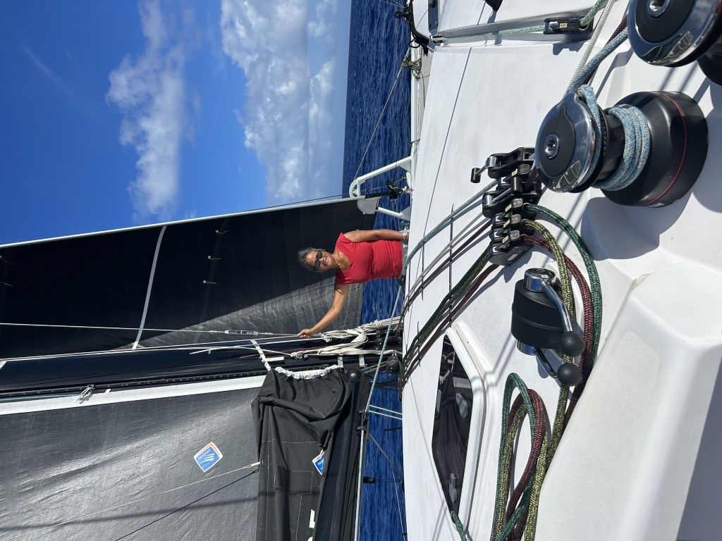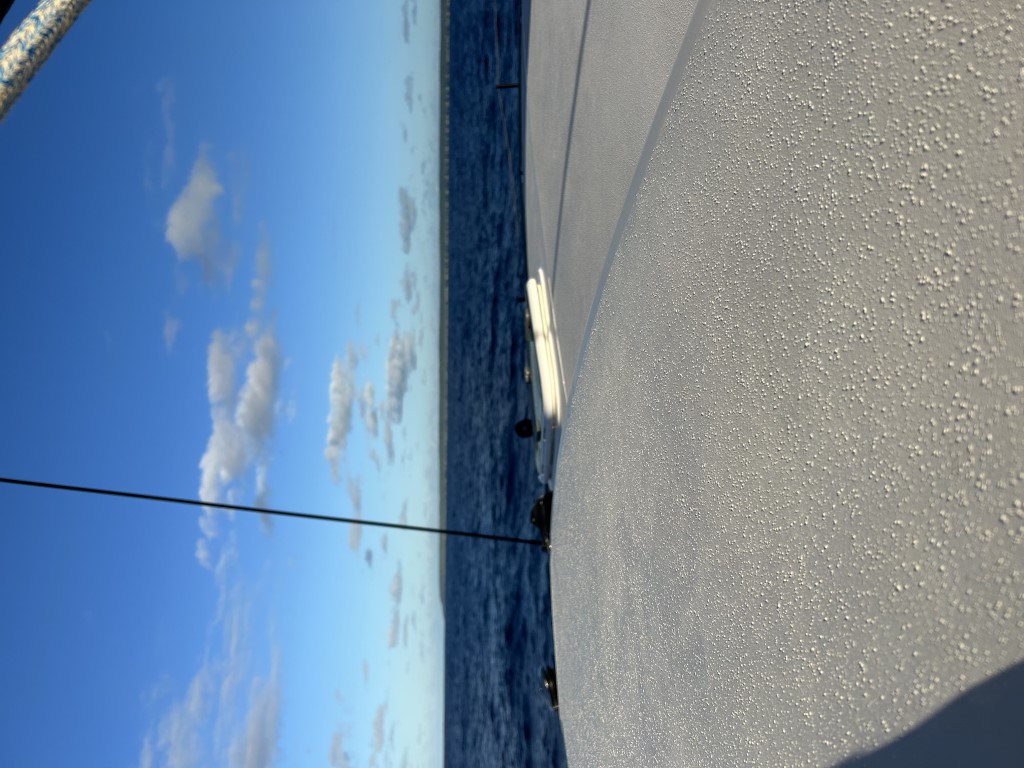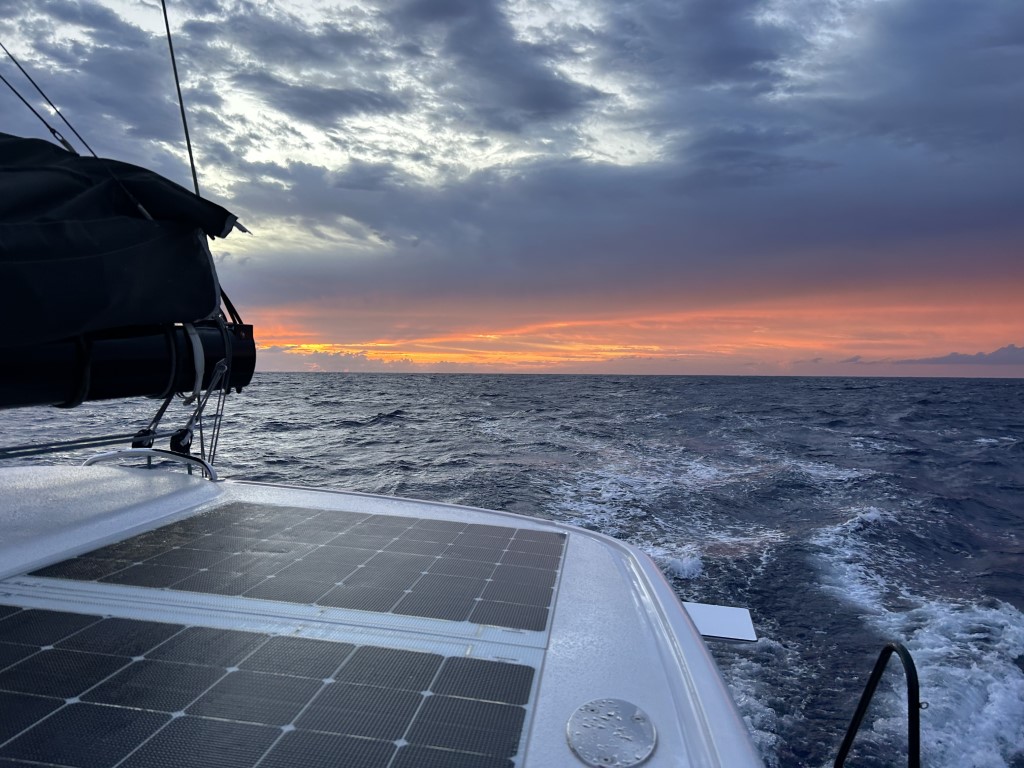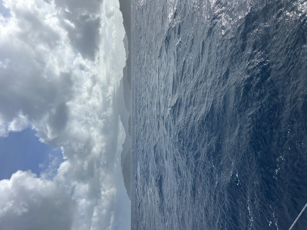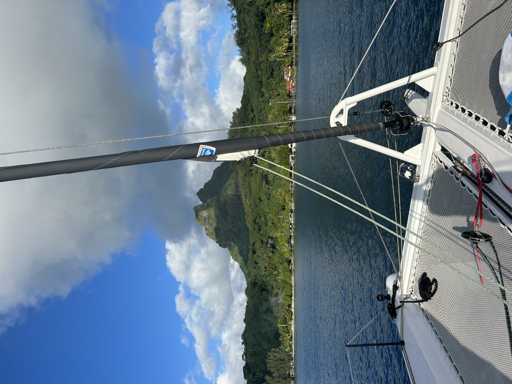 We left Bora Bora three days ago along with the rest of our rally fleet. Our destination of Suwarrow in the Cook Islands lies 690 miles to the west-northwest. We started with light winds and crossed the starting line with our gennaker. Unfortunately, in the process of rounding the first race make, we tore the gennaker on the mast spreader, prompting a sail change to the code zero (and a repair of the gennaker). Later in the afternoon, the winds died and we continued motor sailing for the next 24 hours. Ultimately, the winds returned and we enjoyed a lively downwind sail towards our destination.