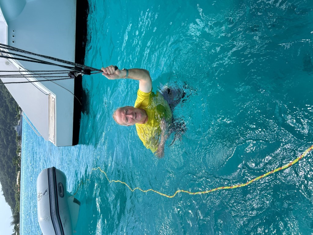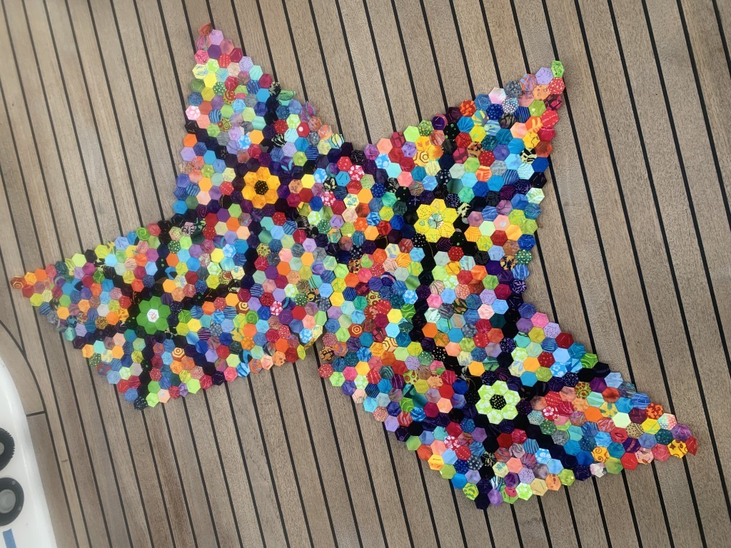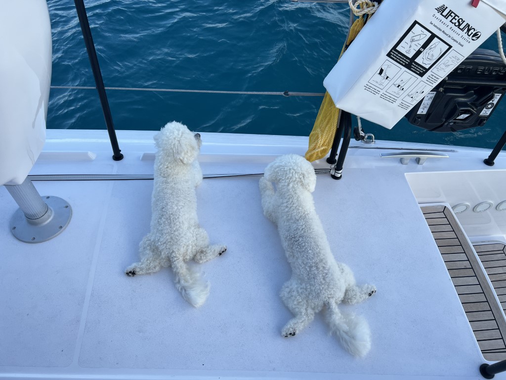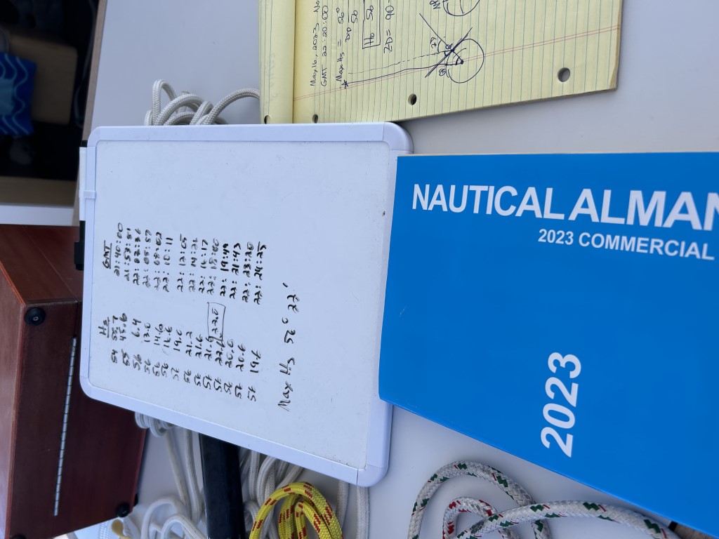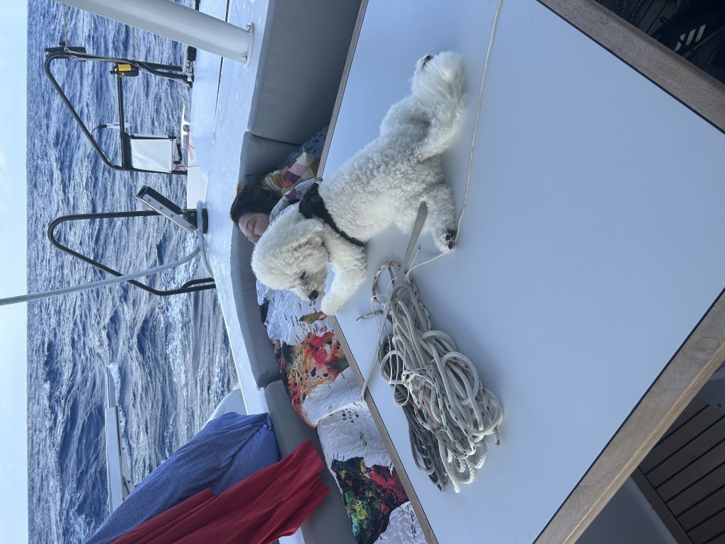 One of the rally staff, Rob, has joined us on this leg. We have practiced celestial navigation, perfecting the “noon sight,” Yong has continued her hand-sewn hexagon quilting, and the dogs continue to enjoy the journey; there are always new sights and smells. We are due to arrive in Suwarrow tomorrow.