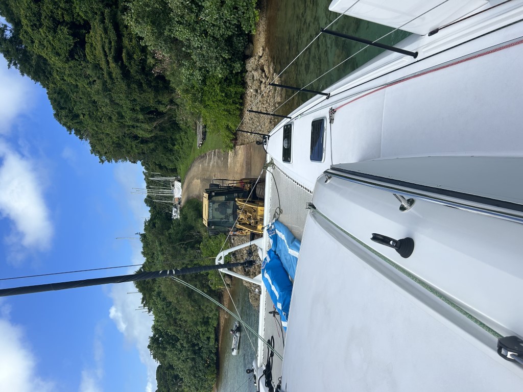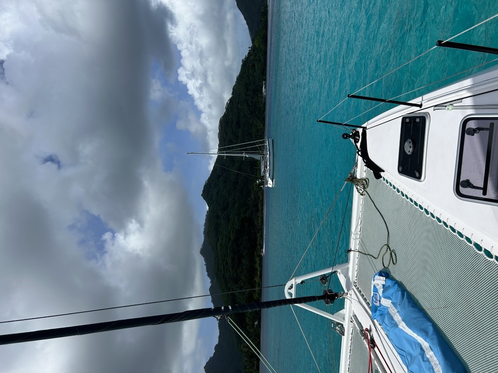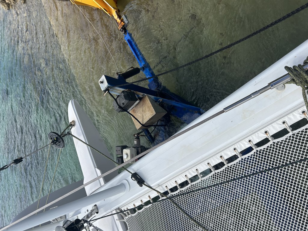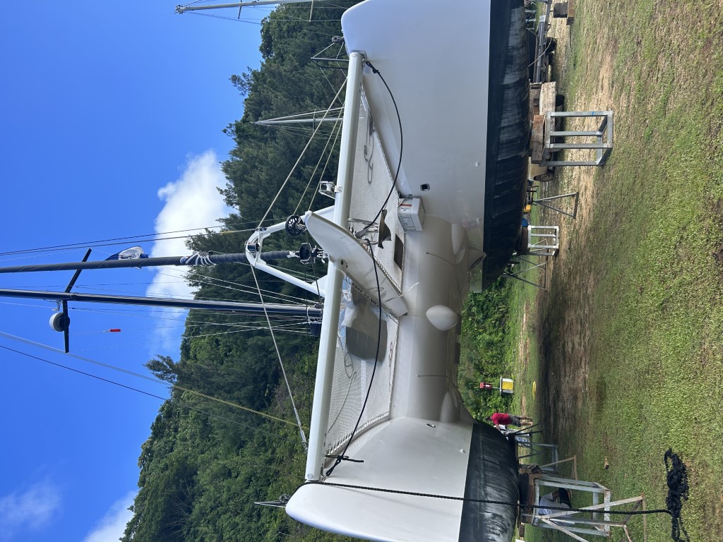 This morning, we motored Leviathan clockwise around the island of Vava’u to the Boatyard. Of course, the winds picked up into the mid-20s just to make things more challenging. We lined up on the partially submerged trailer (which was waiting for us) while the cross-wind tried to blow us onto the shallow adjacent reef. Yong saved the day (yet again) as she got hold of a windward line attached to the shore and secured it to the windward stern cleat of Leviathan. That stabilized our position and the rest was pretty easy. The Boatyard staff were highly skilled and before we knew it, Leviathan was elevated on the longitudinal bunkers and heading up the steep hill to the yard. Leviathan will be positioned on jackstands on land while the work is underway. We should be back in the water by the weekend.