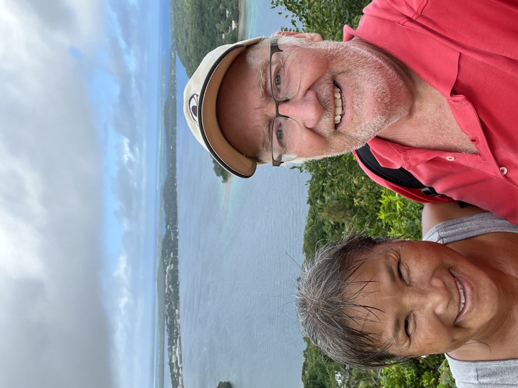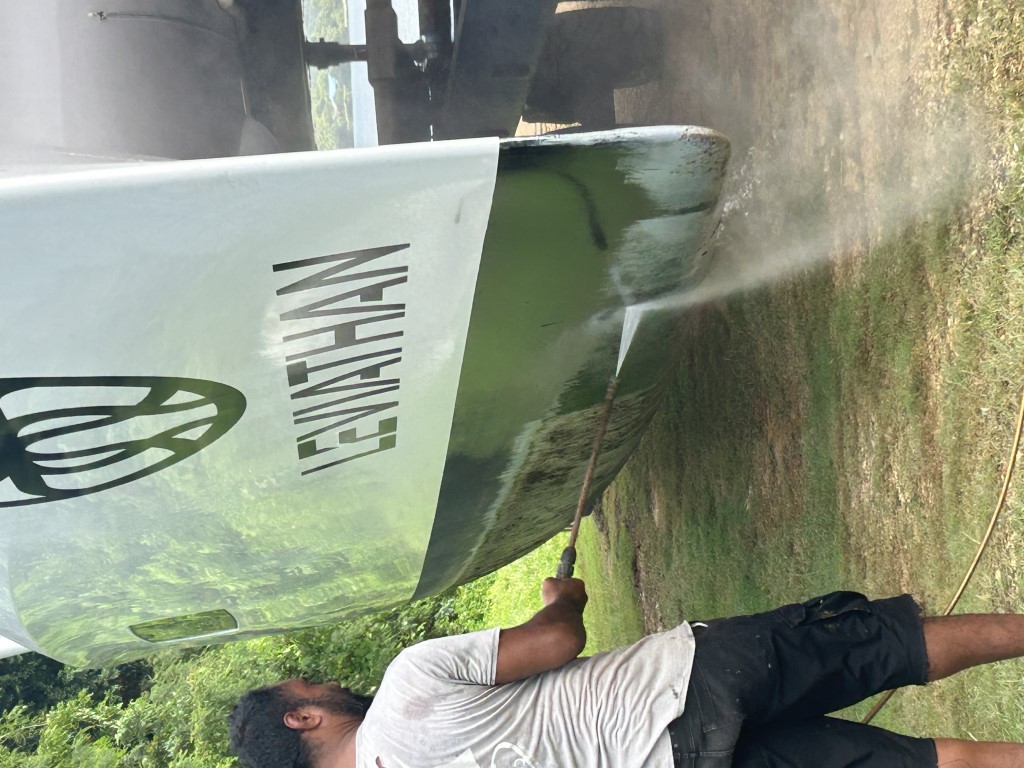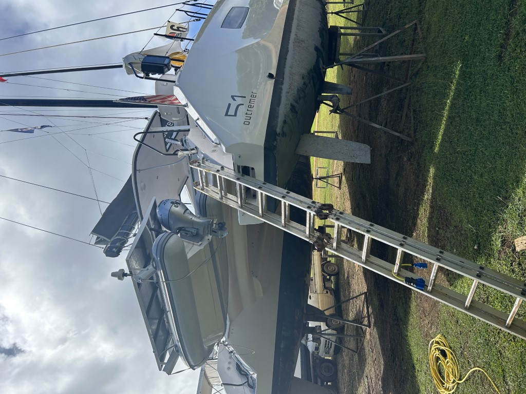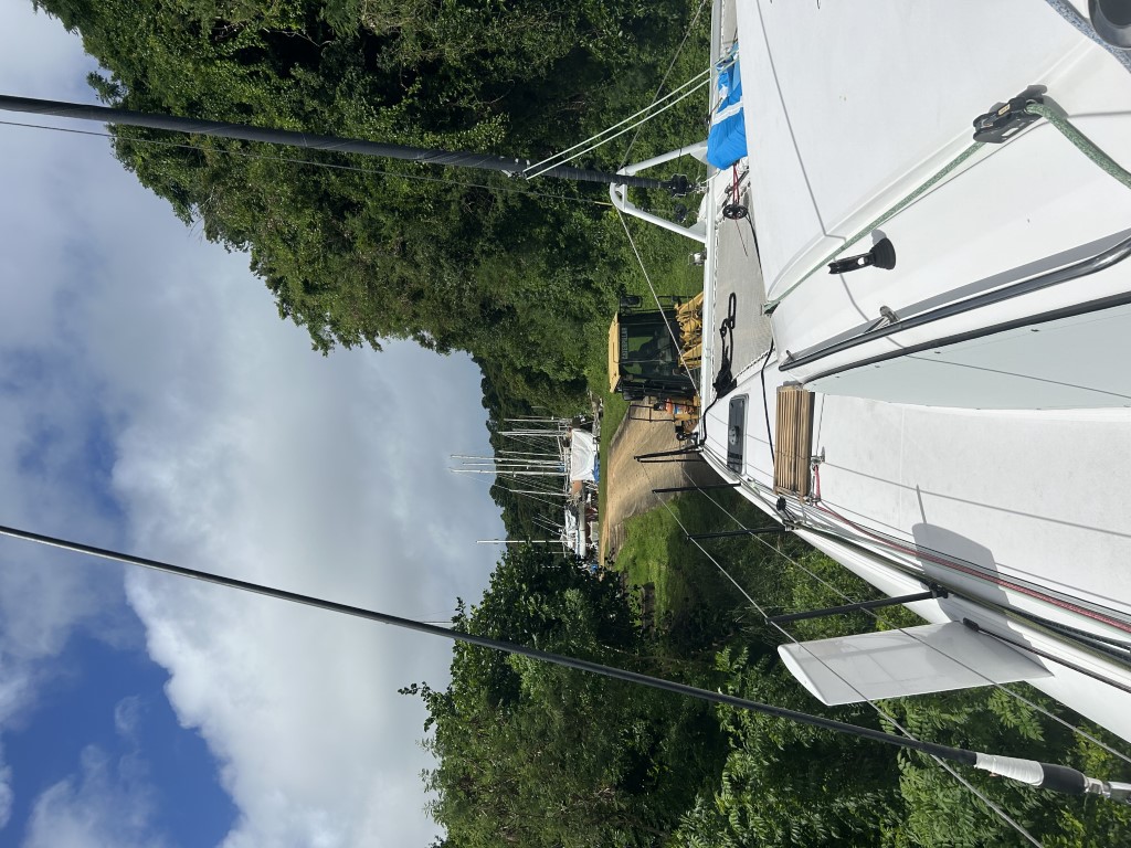This morning, we motored Leviathan clockwise around the island of Vava’u to the Boatyard. Of course, the winds picked up into the mid-20s just to make things more challenging. We lined up on the partially submerged trailer (which was waiting for us) while the cross-wind tried to blow us onto the shallow adjacent reef. Yong saved the day (yet again) as she got hold of a windward line attached to the shore and secured it to the windward stern cleat of Leviathan. That stabilized our position and the rest was pretty easy. The Boatyard staff were highly skilled and before we knew it, Leviathan was elevated on the longitudinal bunkers and heading up the steep hill to the yard. Leviathan will be positioned on jackstands on land while the work is underway. We should be back in the water by the weekend.