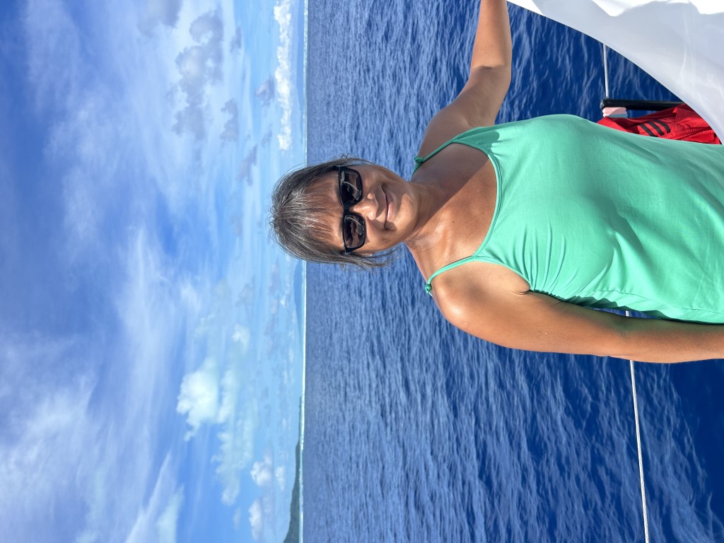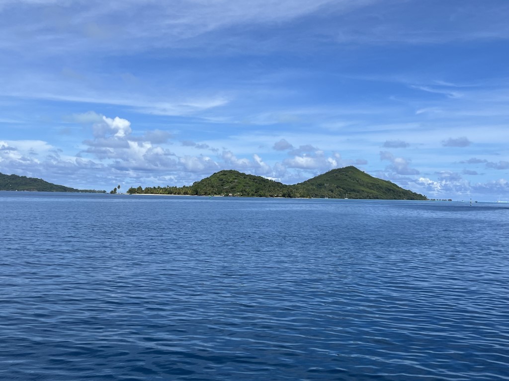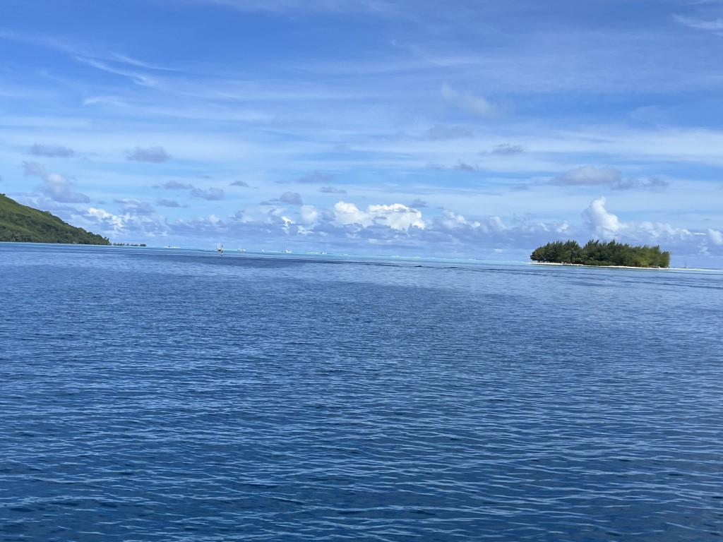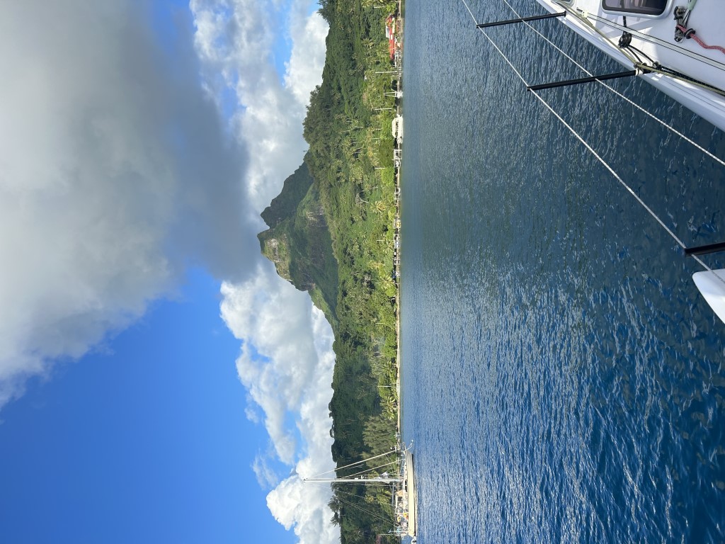 We had a wonderful time anchored in the eastern lagoon of the island of Tahaa. We enjoyed calm waters, beautiful weather, and excellent swimming conditions. We also had a chance to socialize with several other boats in our rally including Thetis, Renegade, and Cepa. We enjoyed a nice dinner at a local restaurant which served grilled fresh caught parrot fish (very good). After a couple days, we elected to proceed to Bora Bora, our ultimate destination in French Polynesia. Before we could leave, however, we faced a bit of a struggle with our anchor chain which had wrapped around a large coral bommie. Our depth was only about 20 feet, so I was able to swim down to make an assessment. I was able to partially free the chain, but it remained wedged beneath one portion of the monolith. Nonetheless, once we understood the geometry of the problem, we were able to maneuver the boat under engine to make our escape and retrieve our anchor. Next stop: Bora Bora!