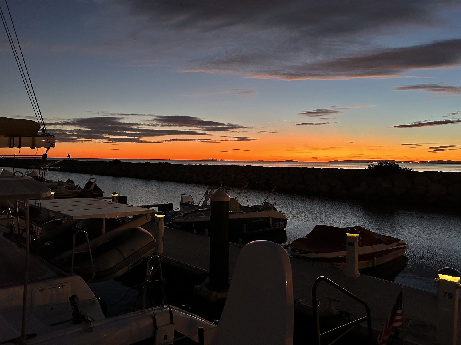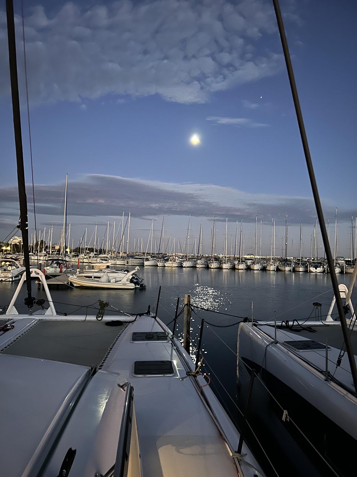 Today is Saturday, so no work will be done on the boat. As a result, we are free to do some shopping and a little sightseeing. Bob and Diane are exploring eastward toward Barcelona and will return next week. After a few stops in nearby Montpellier, we journeyed to the harbor town of Sete, about thirty minutes away. Sete is at least a couple thousand years old. The town is located on a large harbor which feeds into multiple canals which connect with a massive lagoon. We parked, wandered around the old part of town, and enjoyed the local specialty, moules mariniere (mussels steamed with garlic and onions). We noted that just like every possible parking spot along the narrow streets was occupied by a vehicle, every square foot of waterfront had a boat tied up to it. We made it back to Leviathan in time for another beautiful sunset.