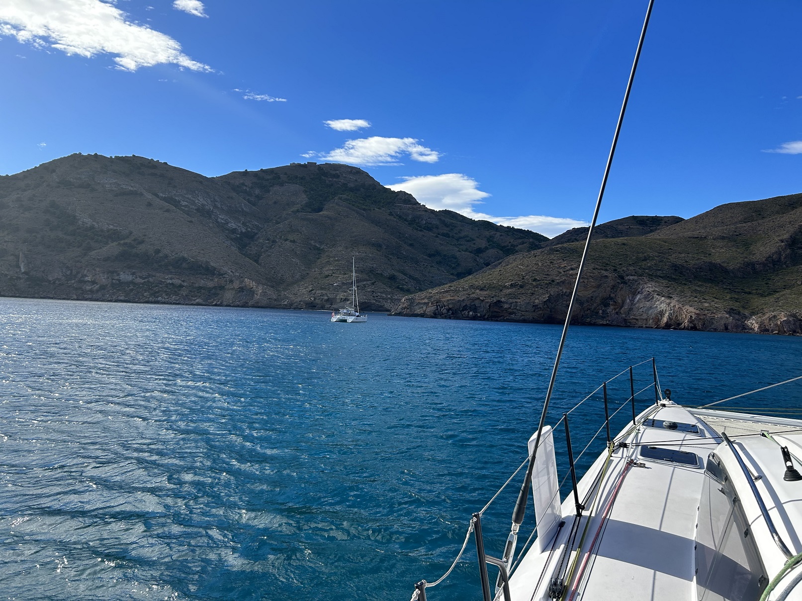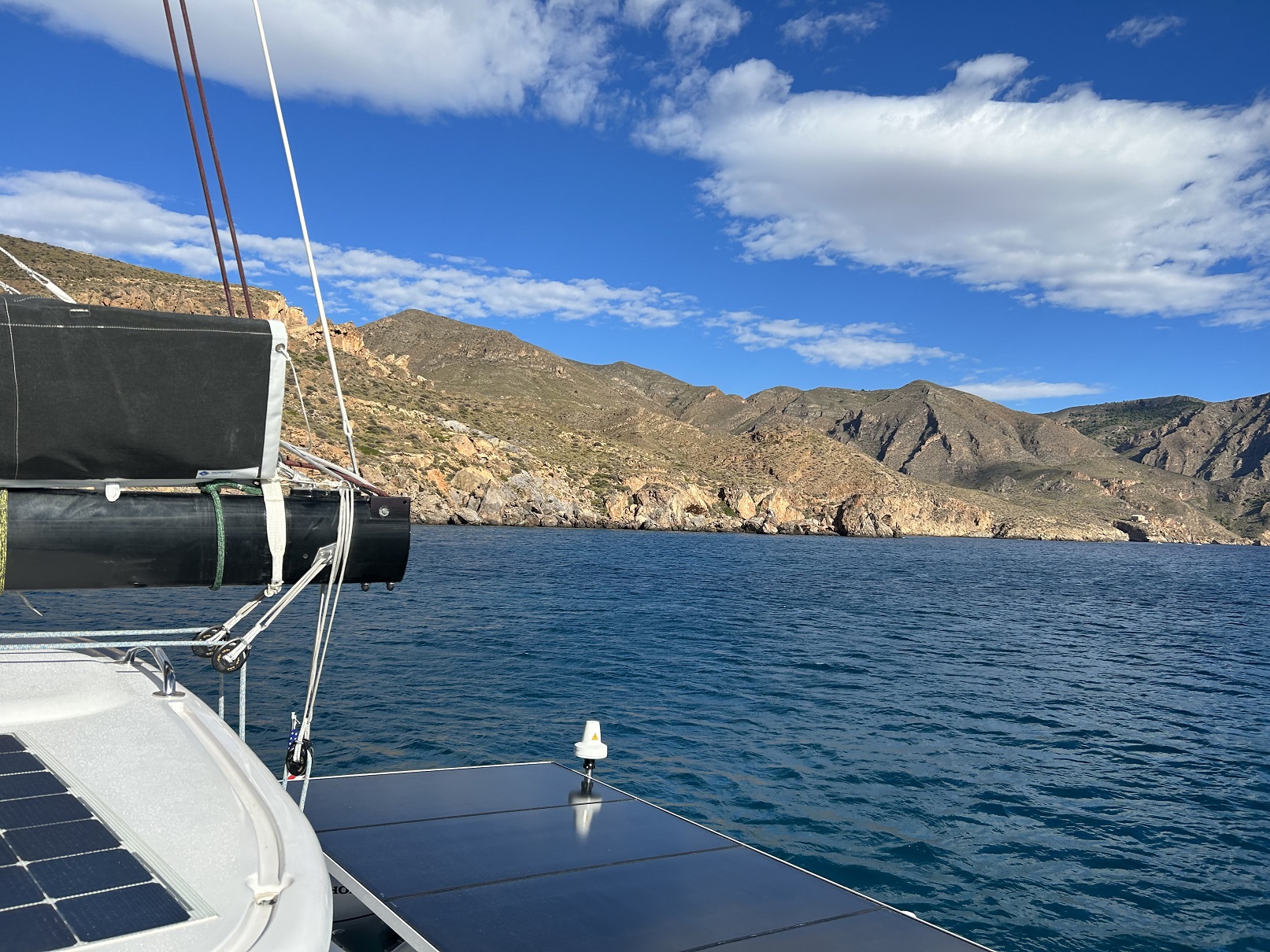 We left Cartagena for Almeria with beautiful skies and a favorable weather forecast. This quickly transformed into rain, squalls, and sustained 30-knot winds (with gusts to 35). Multiple reefs, sail changes, drenching downpours, wintry temperatures, and a near-disastrous spinnaker takedown contributed to the frivolity. We limped into the anchorage before dawn, capping off a 100-mile day that will be long-remembered. We will recover for a day in Almeria before we attempt our final leg to Gibraltar.